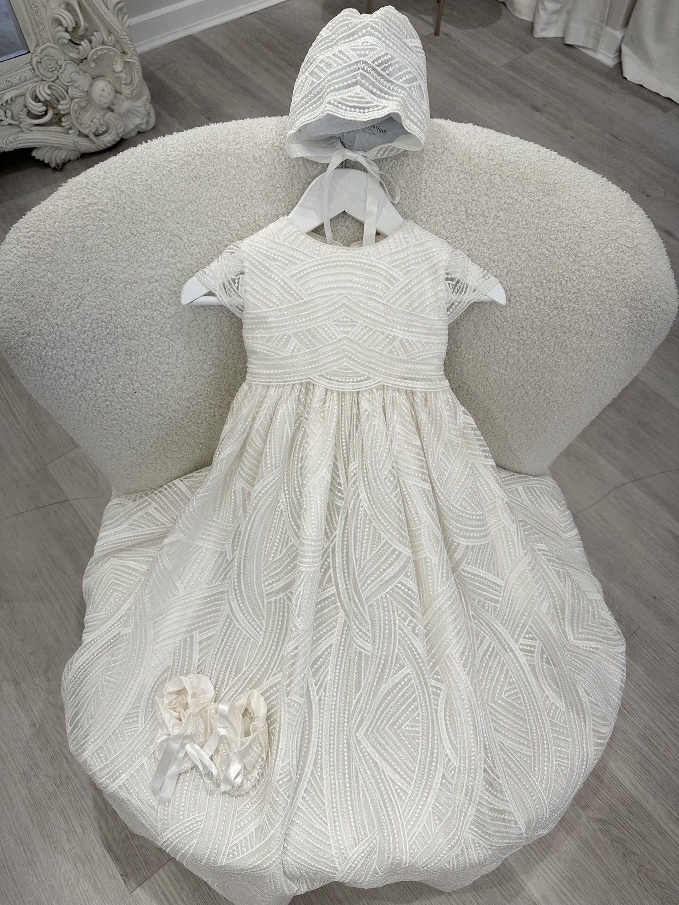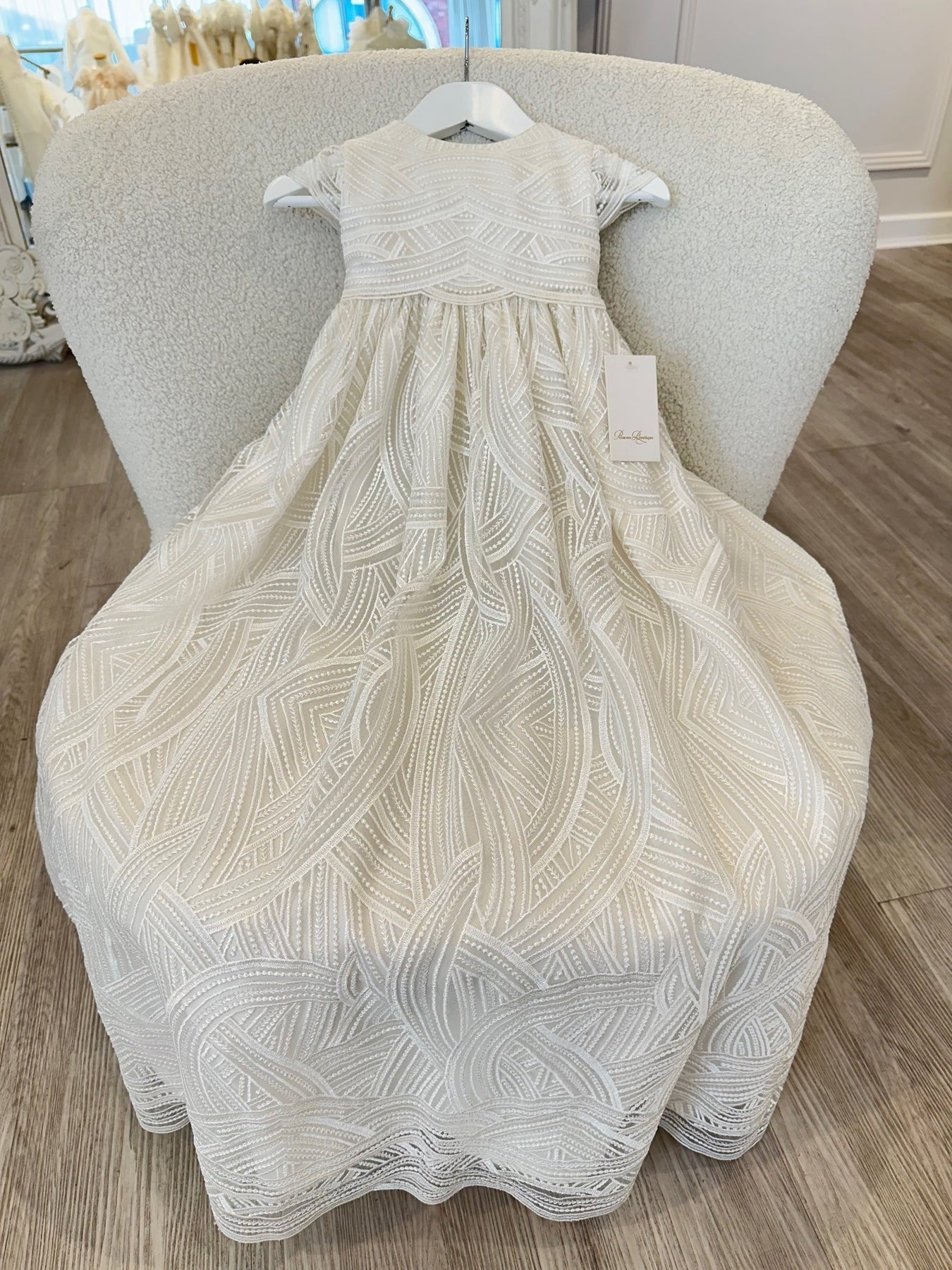 The Pierre Gown is made in Melbourne featuring a stunning embroidered lace with short sleeves and 100% silk lining.