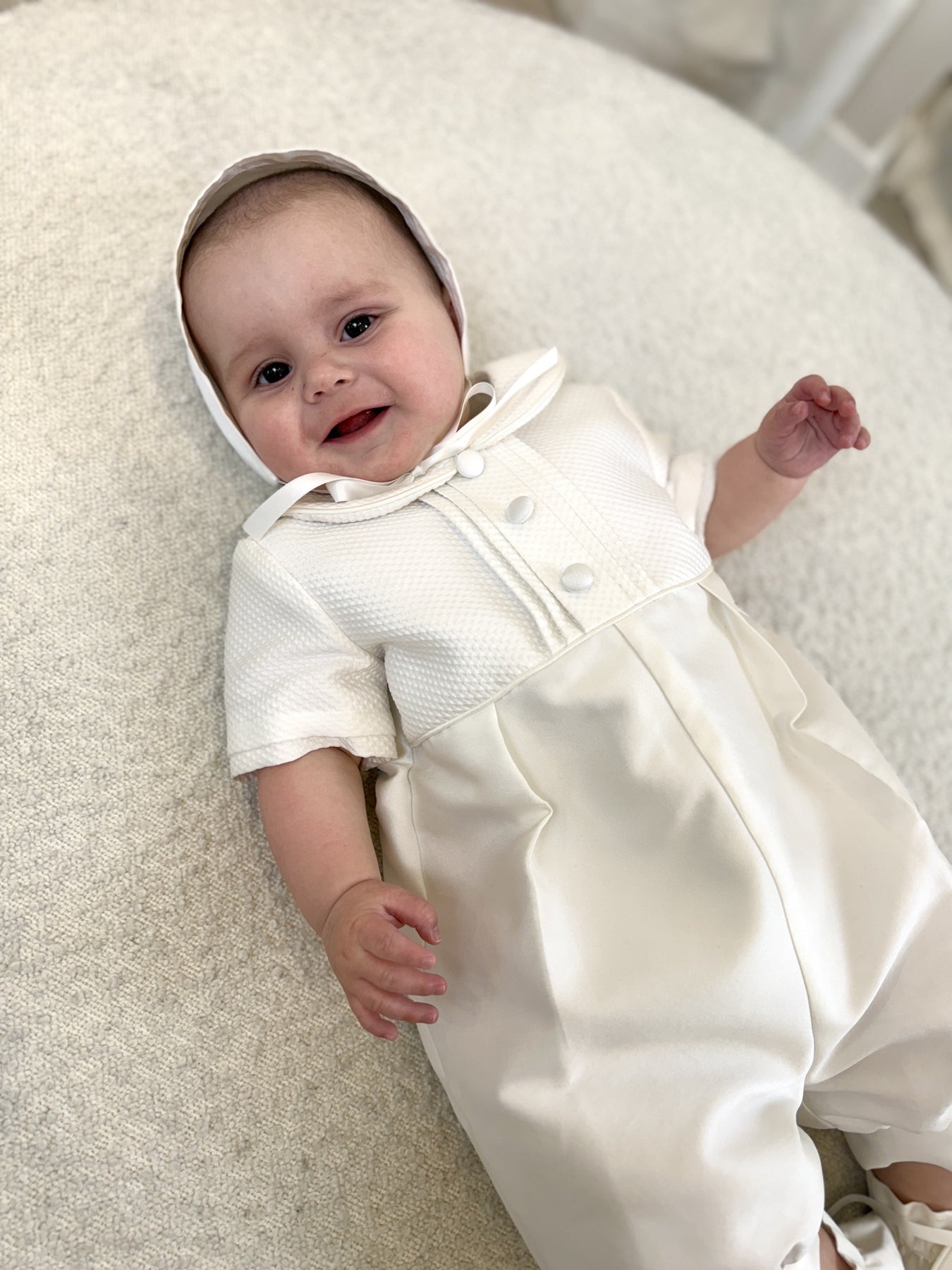 The adorable Enzo Romper is made from a luxurious mikado material with waffle bodice.