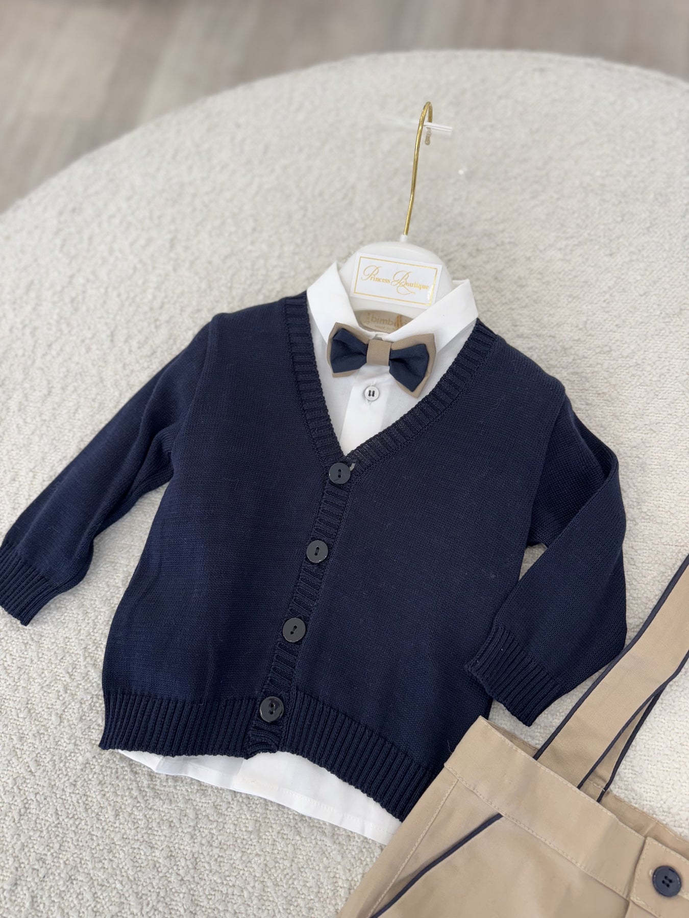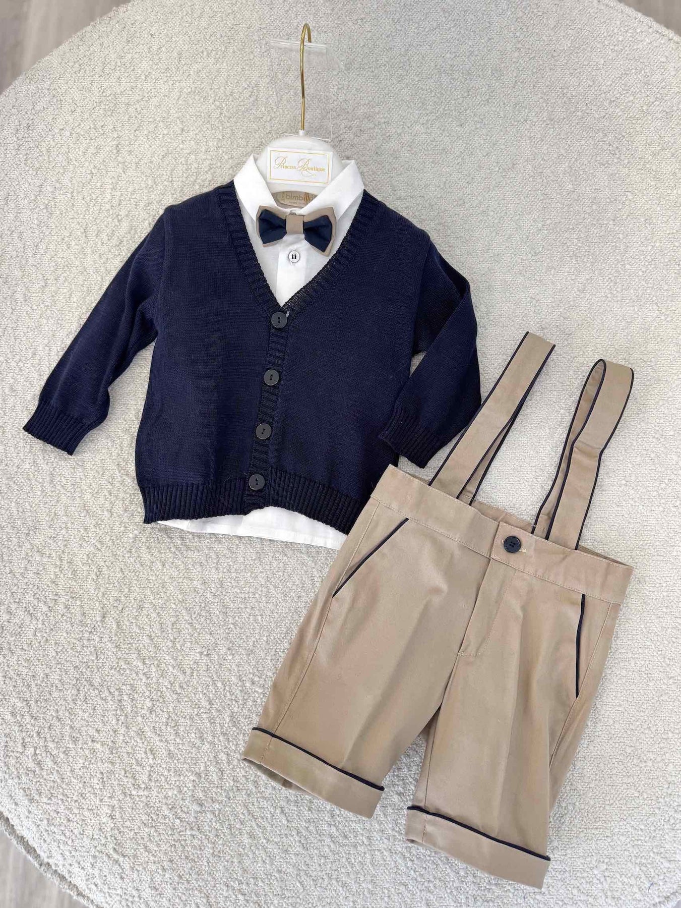 Adorable outfit including shorts with suspenders, shirt, bow tie & knitted cardigan.