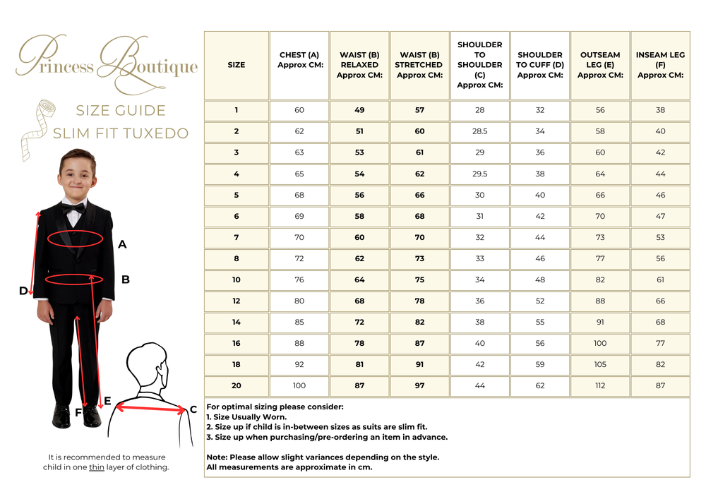 Note: As the suit is a slim fit, consider going up a size (ie. size 6 would order 7, size 10 would order size 12, etc).