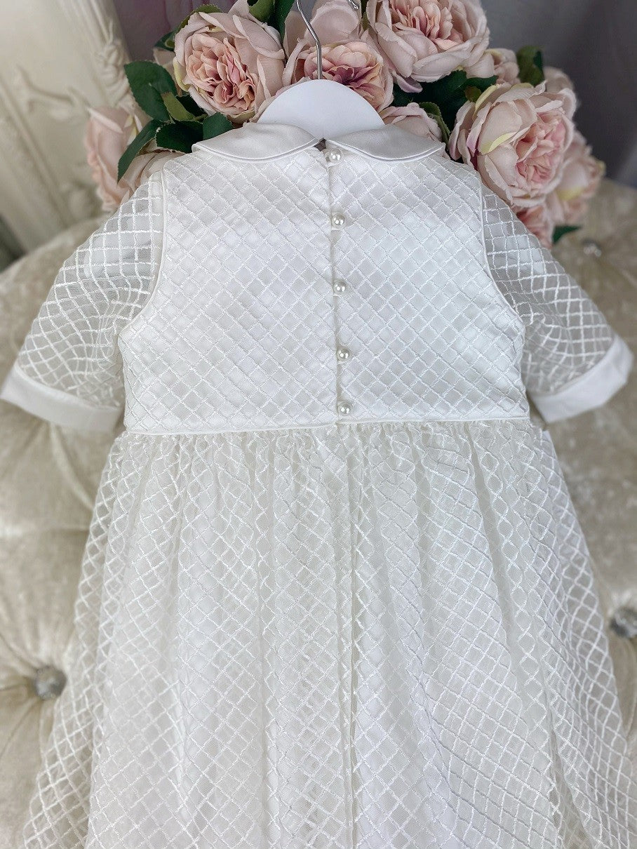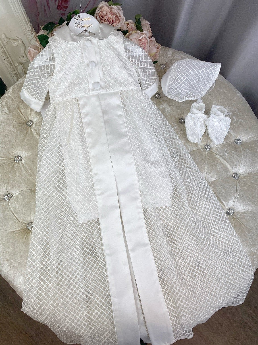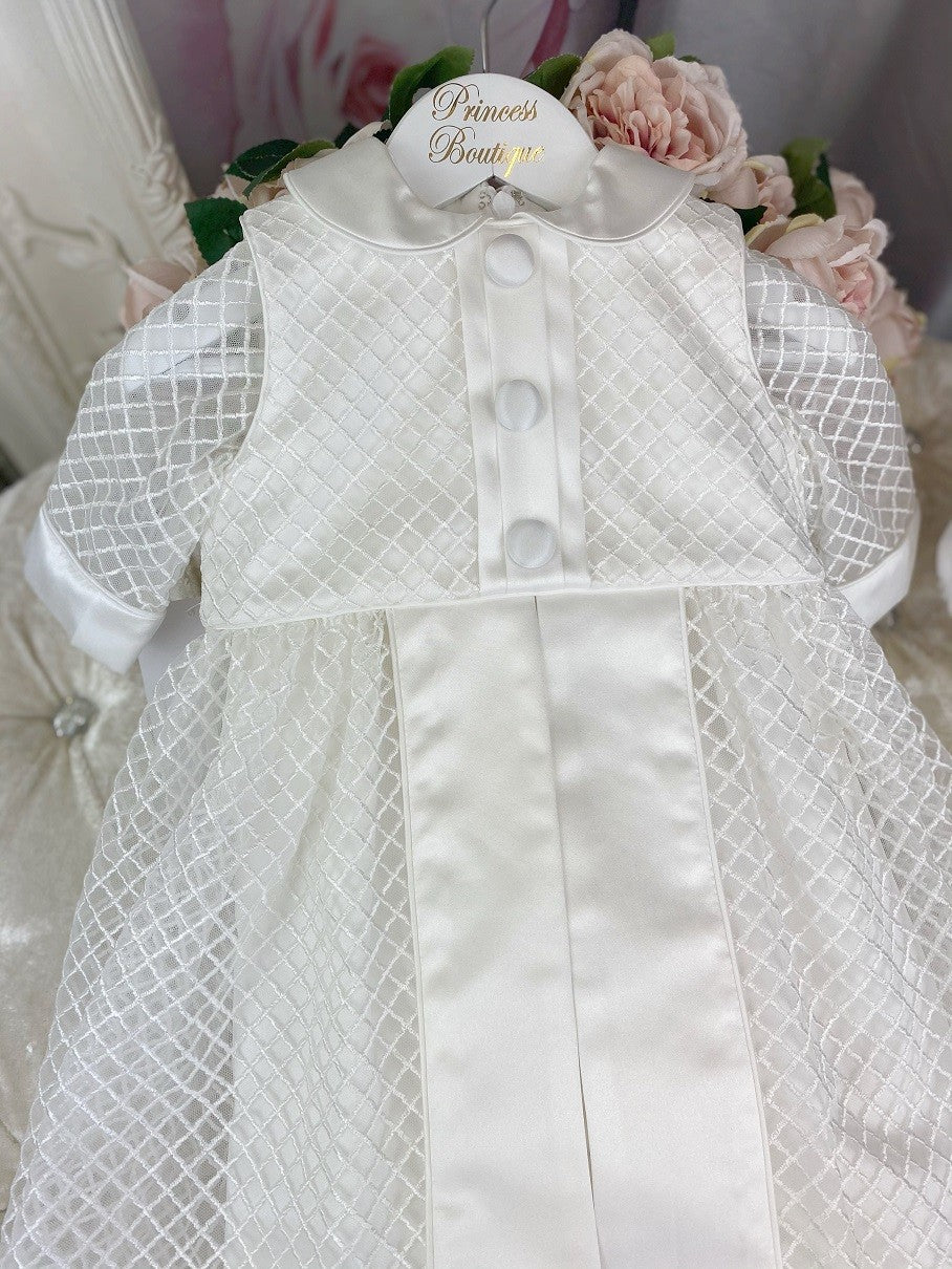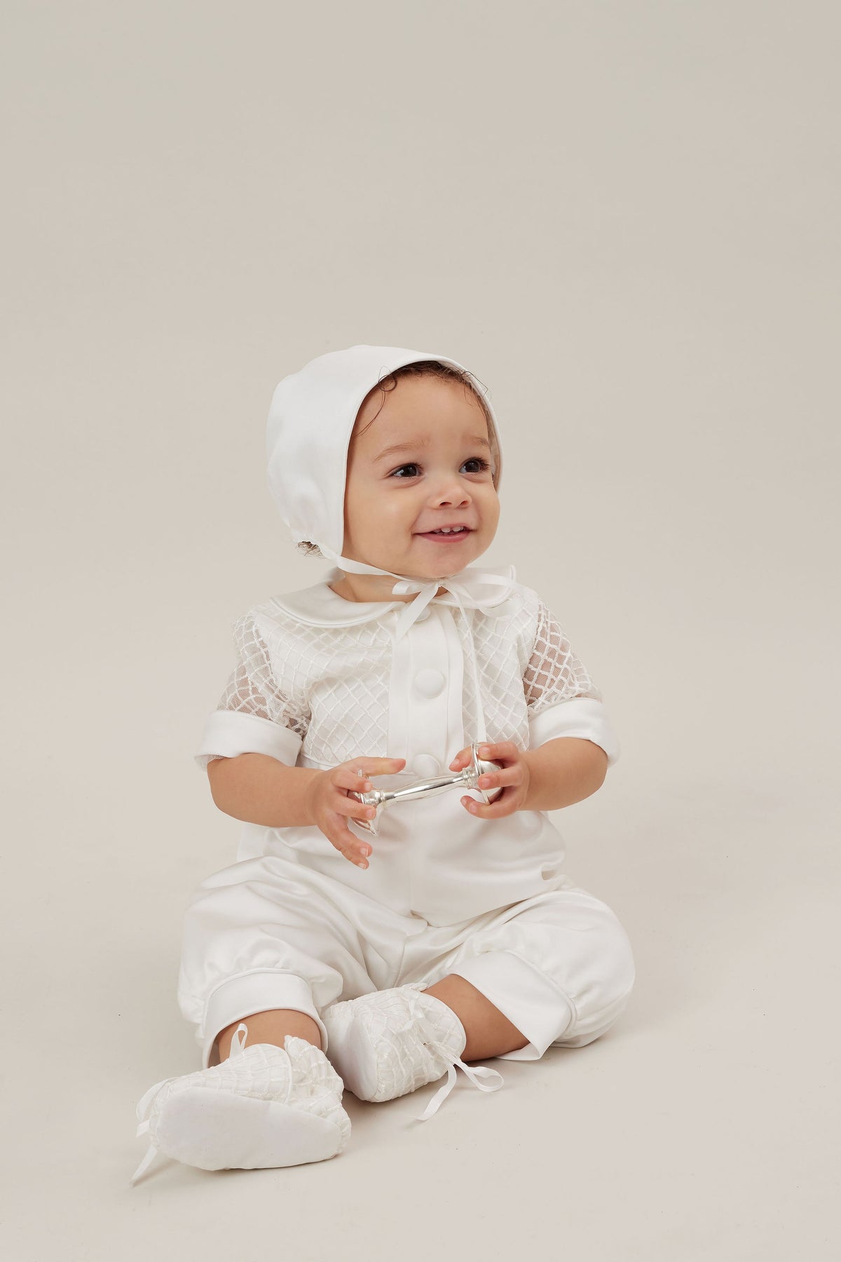 The Billy romper and cape set includes a removable cape with criss-cross design, coordinating romper, bonnet and booties. The cape can be worn during the ceremony and removed to reveal the adorable romper for the reception.