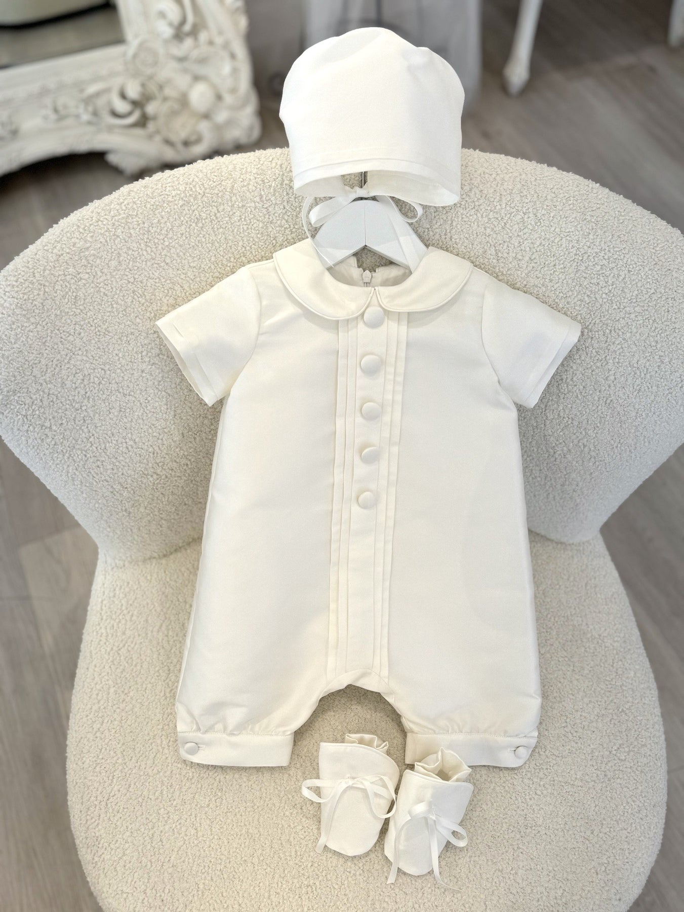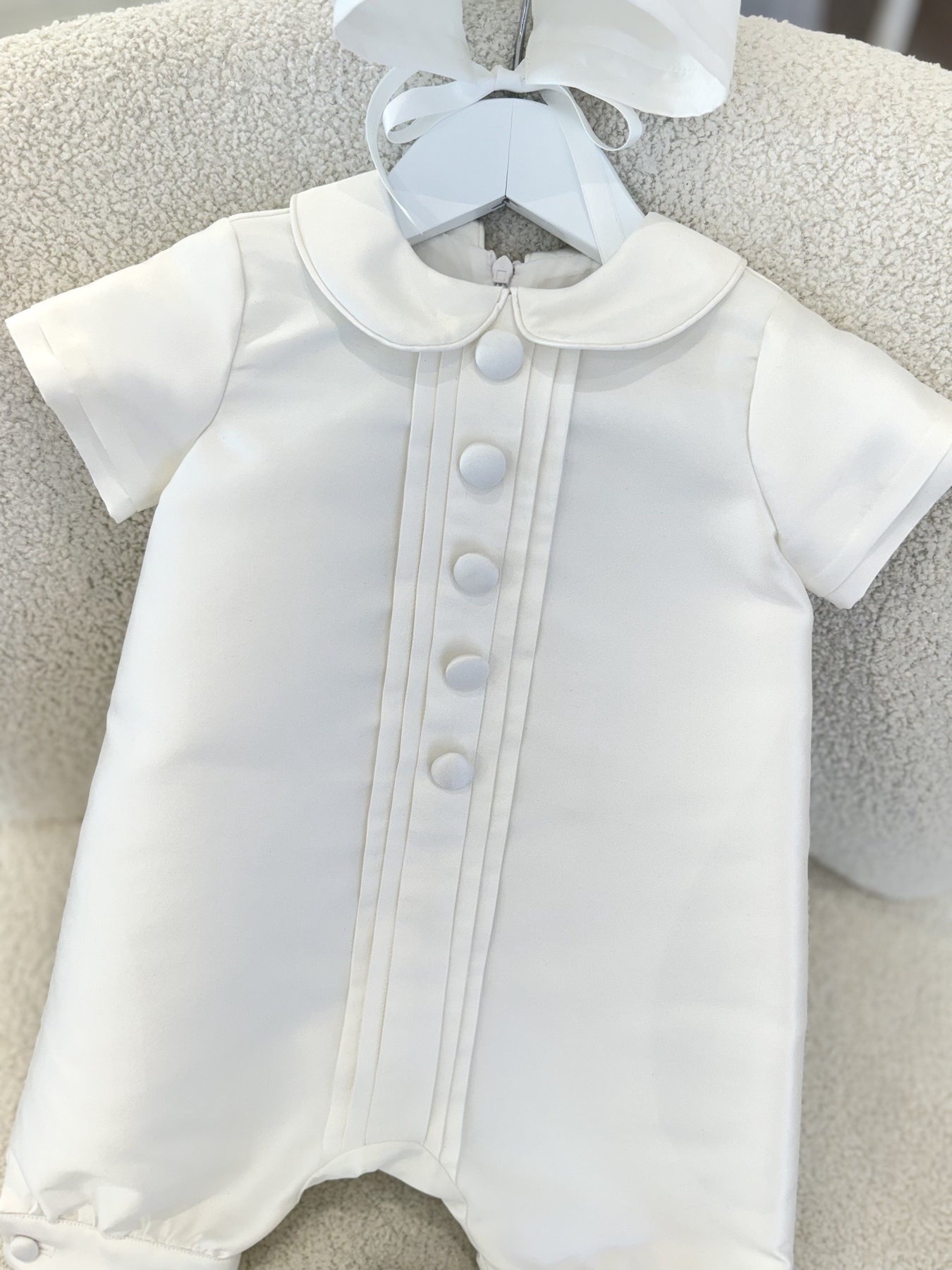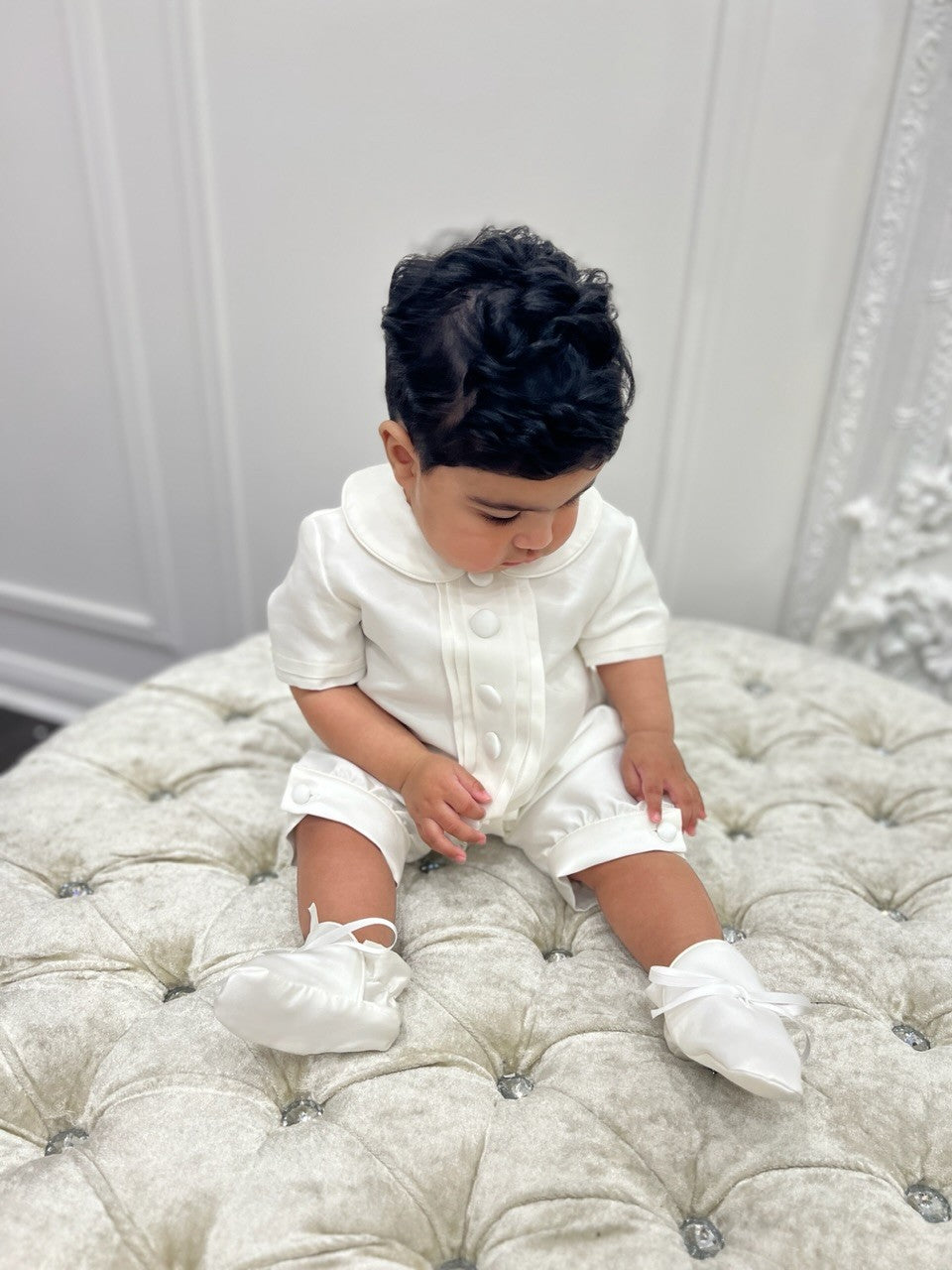 The gorgeous Luxe Liam Romper is absolutely precious. Liam is Made in Melbourne from a luxurious mikado material.
