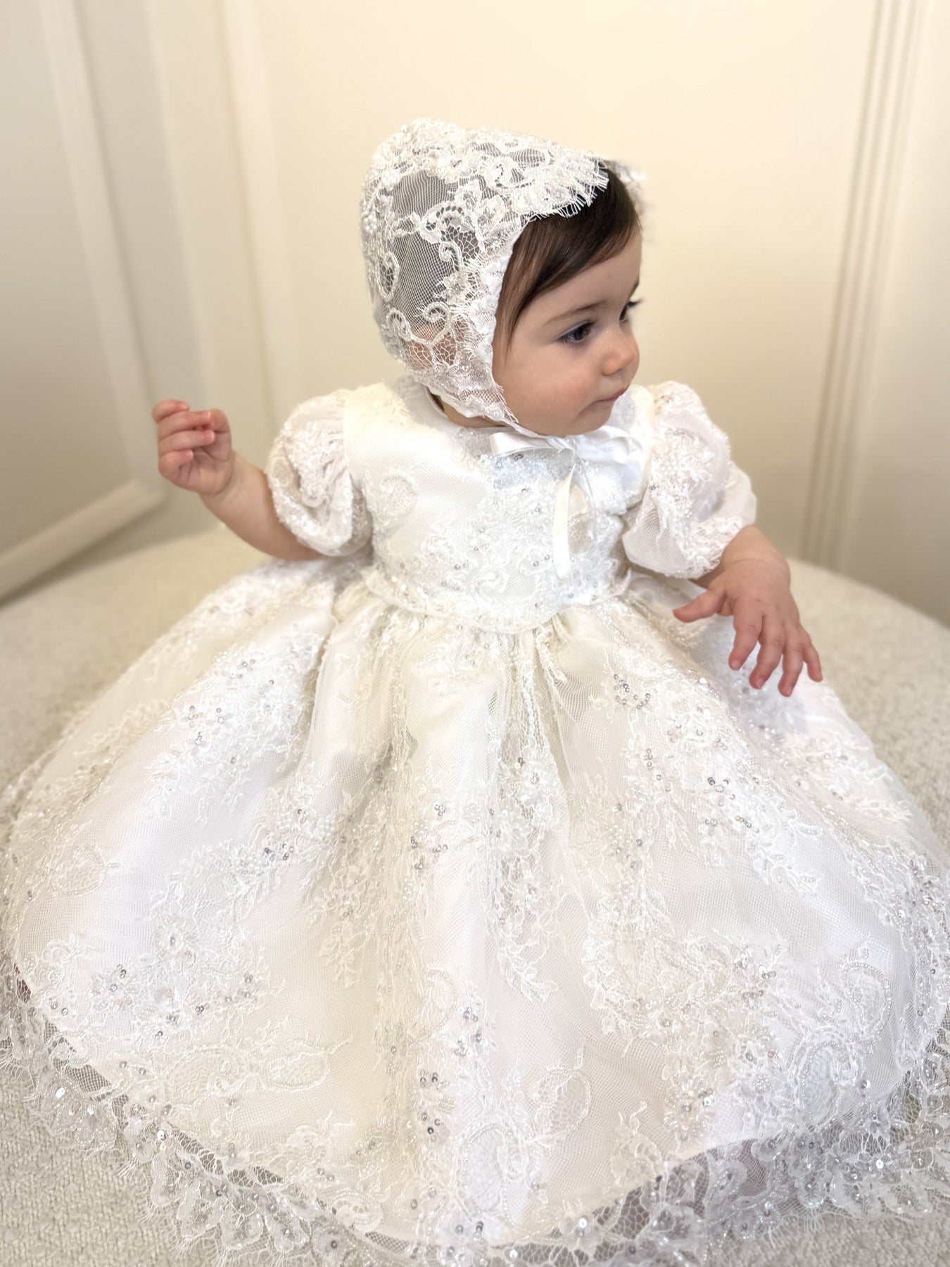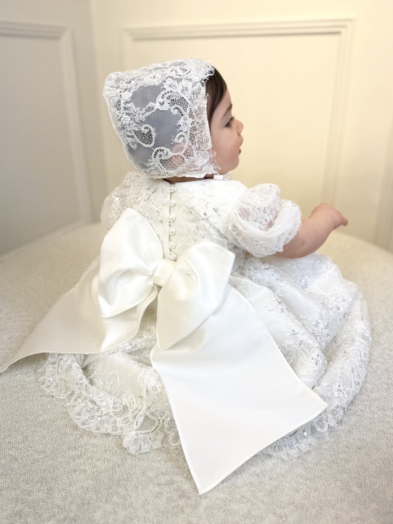 The Elaina Dress is handmade in Melbourne from a stunning luxe beaded lace. The dress is lined with silk-mikado and has a gorgeous bow on the back.