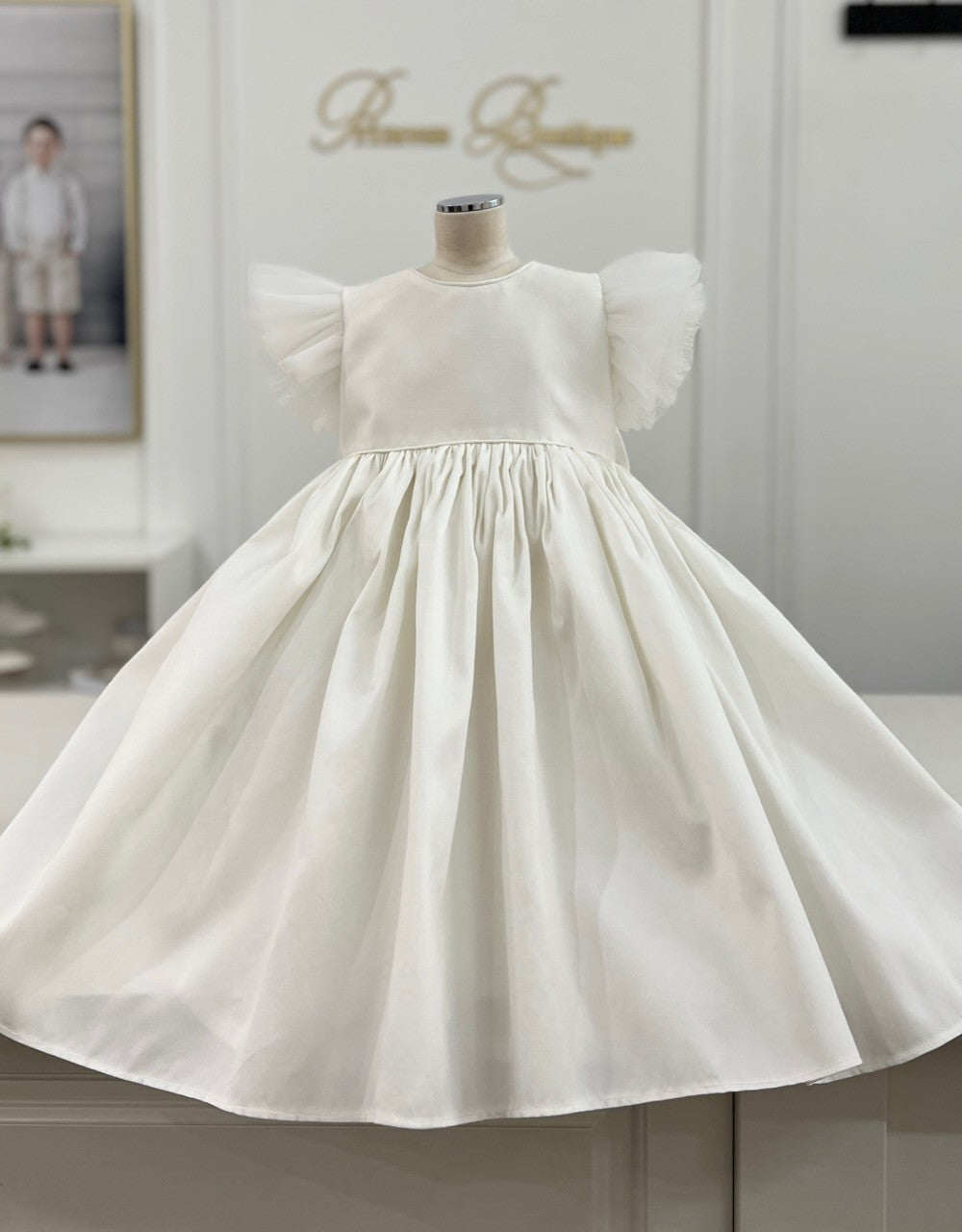 Luxe Made in Melbourne dress with gathered skirt and bow on the back.
