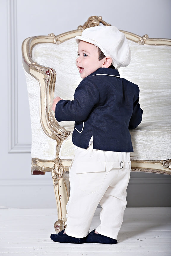 Pictured in Navy Linen Jacket with Ivory Silk-Linen Piping & Ivory Silk-Linen Pants.