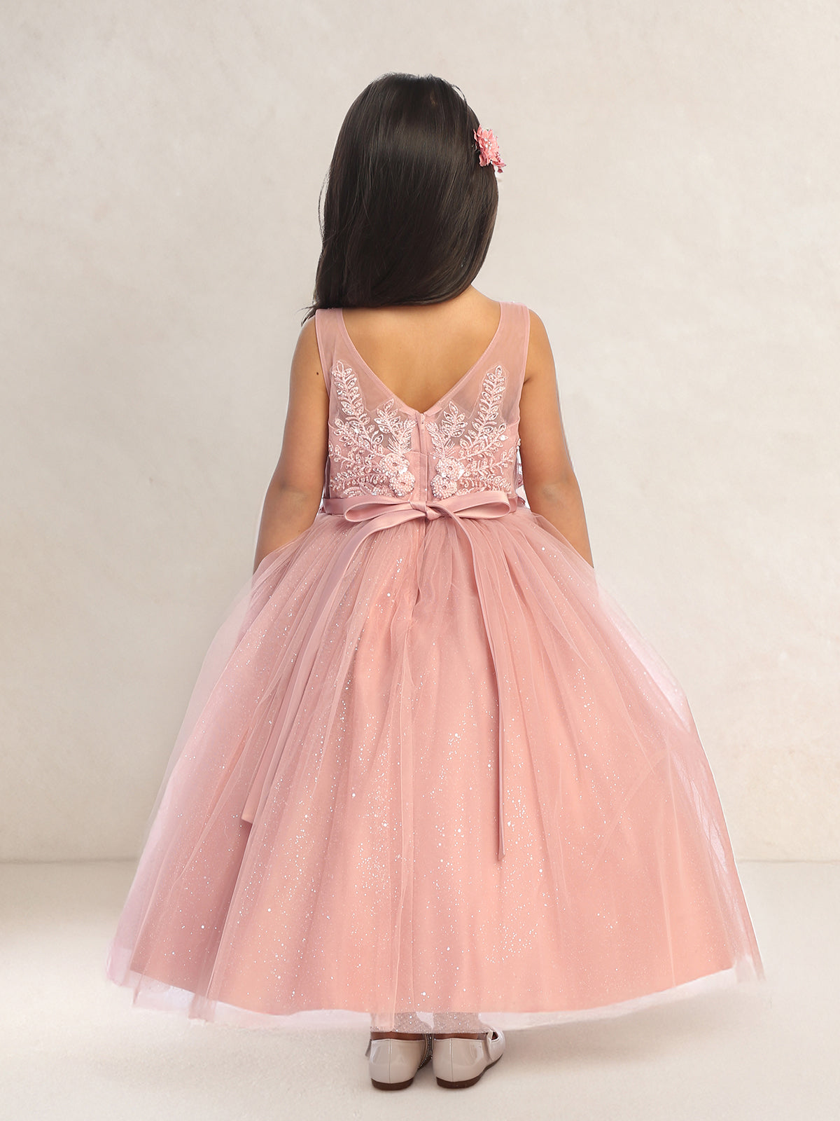Stunning dusty rose dress with 3D floral bodice, shoulder bows, and glitter tea-length tulle skirt.