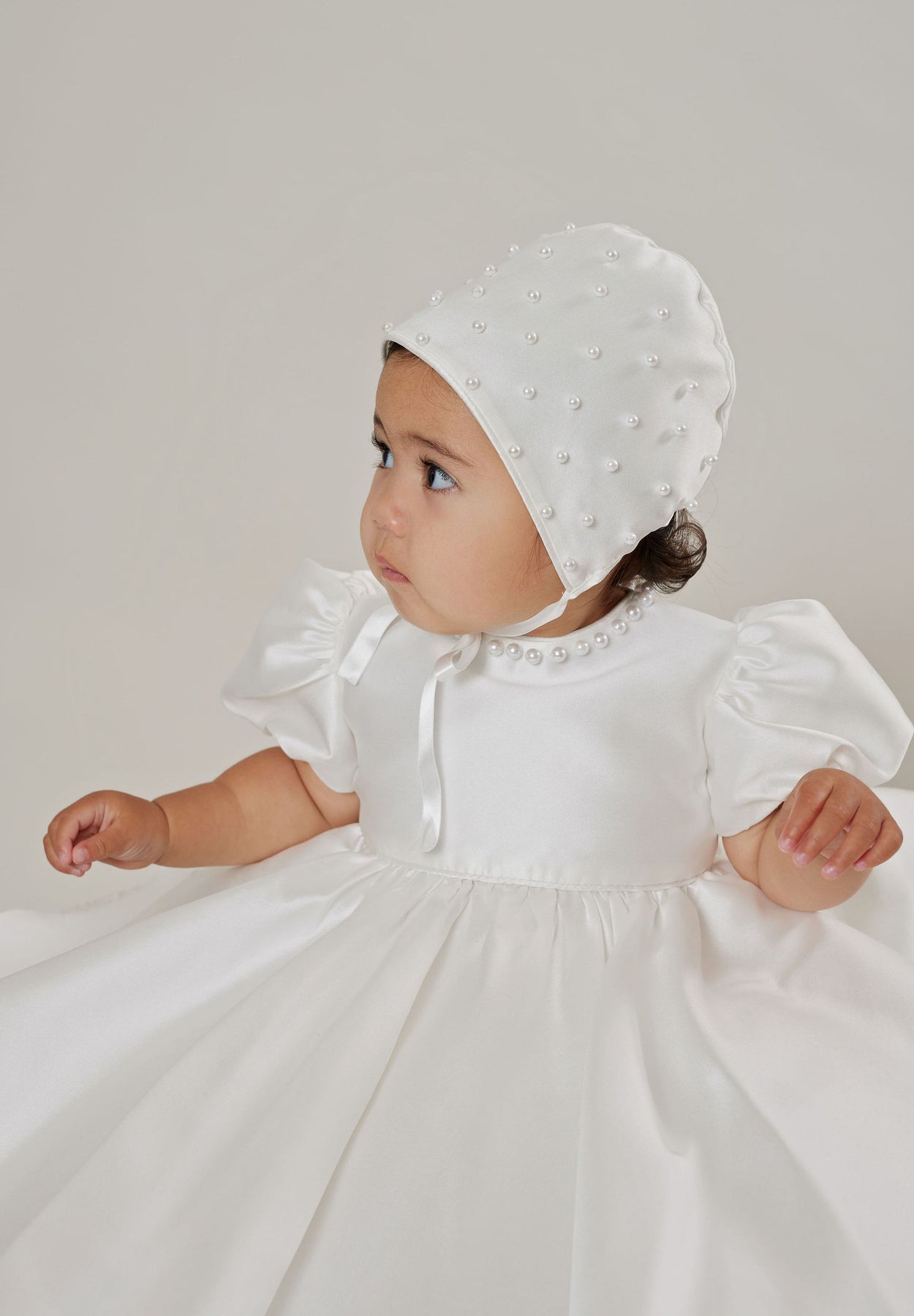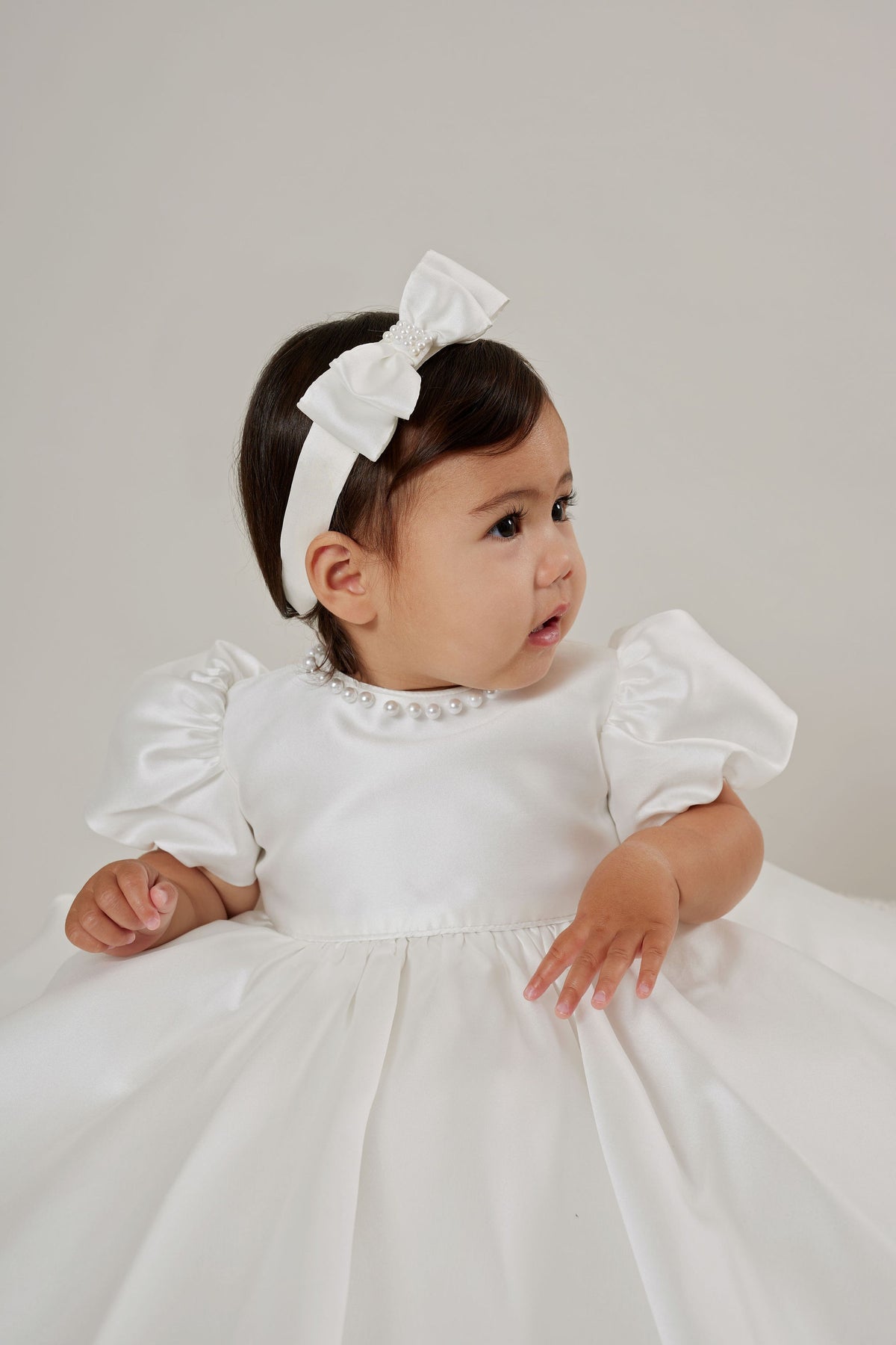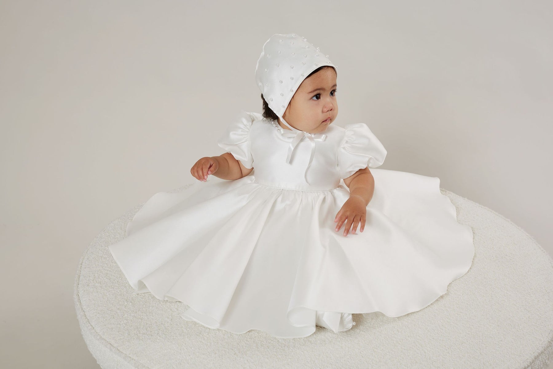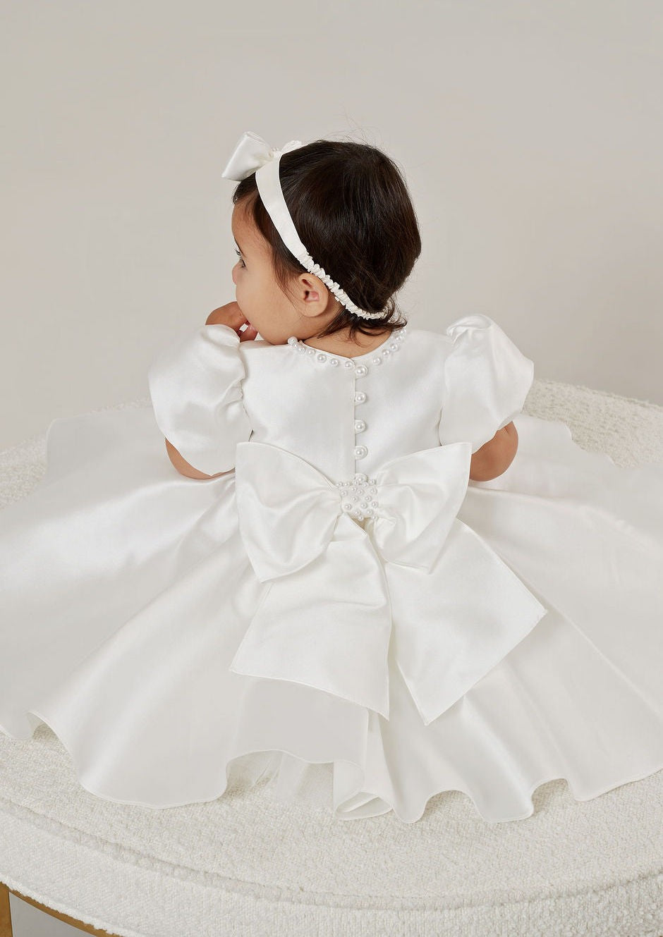 The stunning Blair dress is handmade from luxe mikado material. The dress has a circle skirt, puff sleeves, bow on the back, and pearl details.