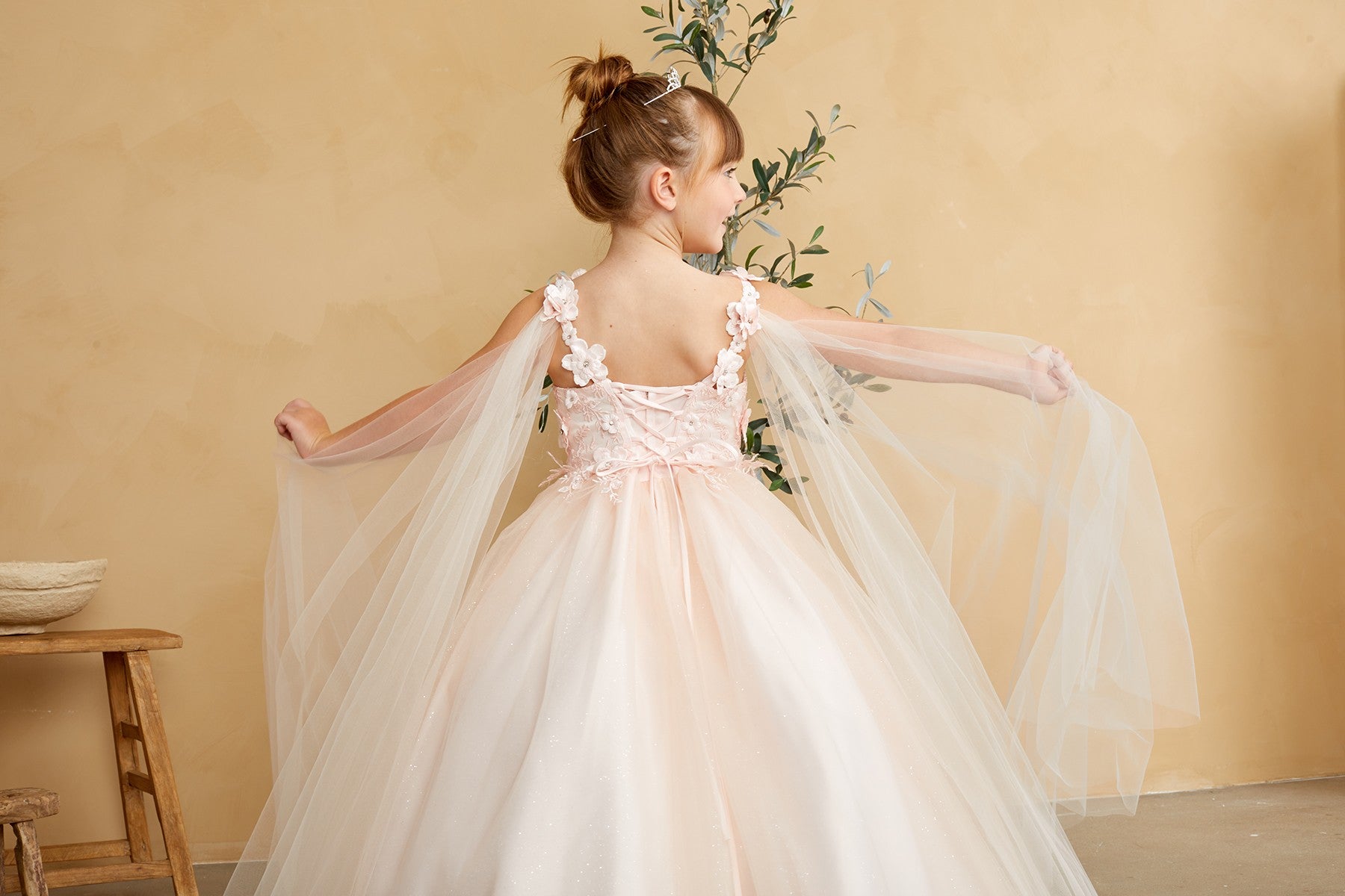 Gorgeous 3D Floral Bodice with Glitter Tulle Skirt and Detachable Cape
