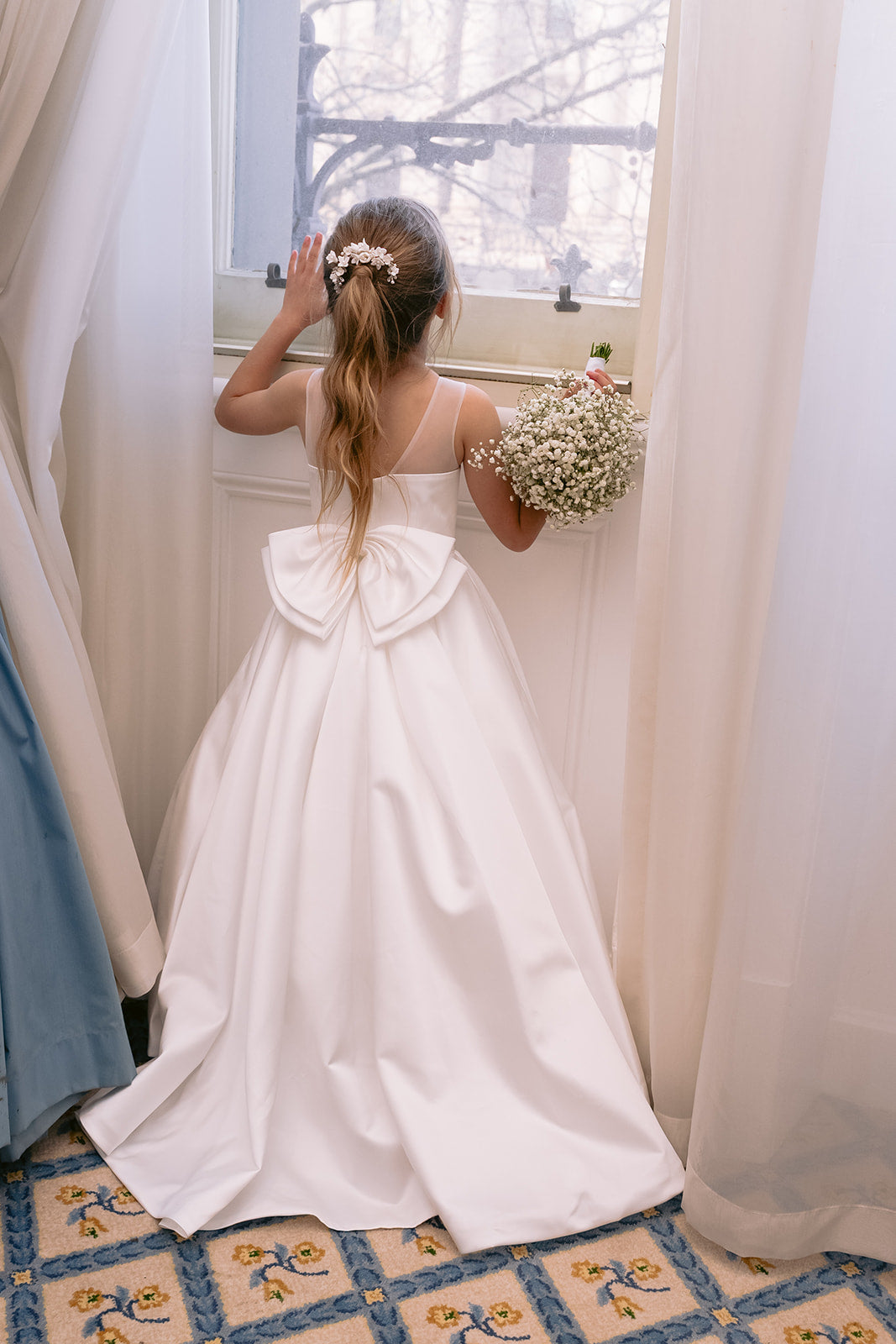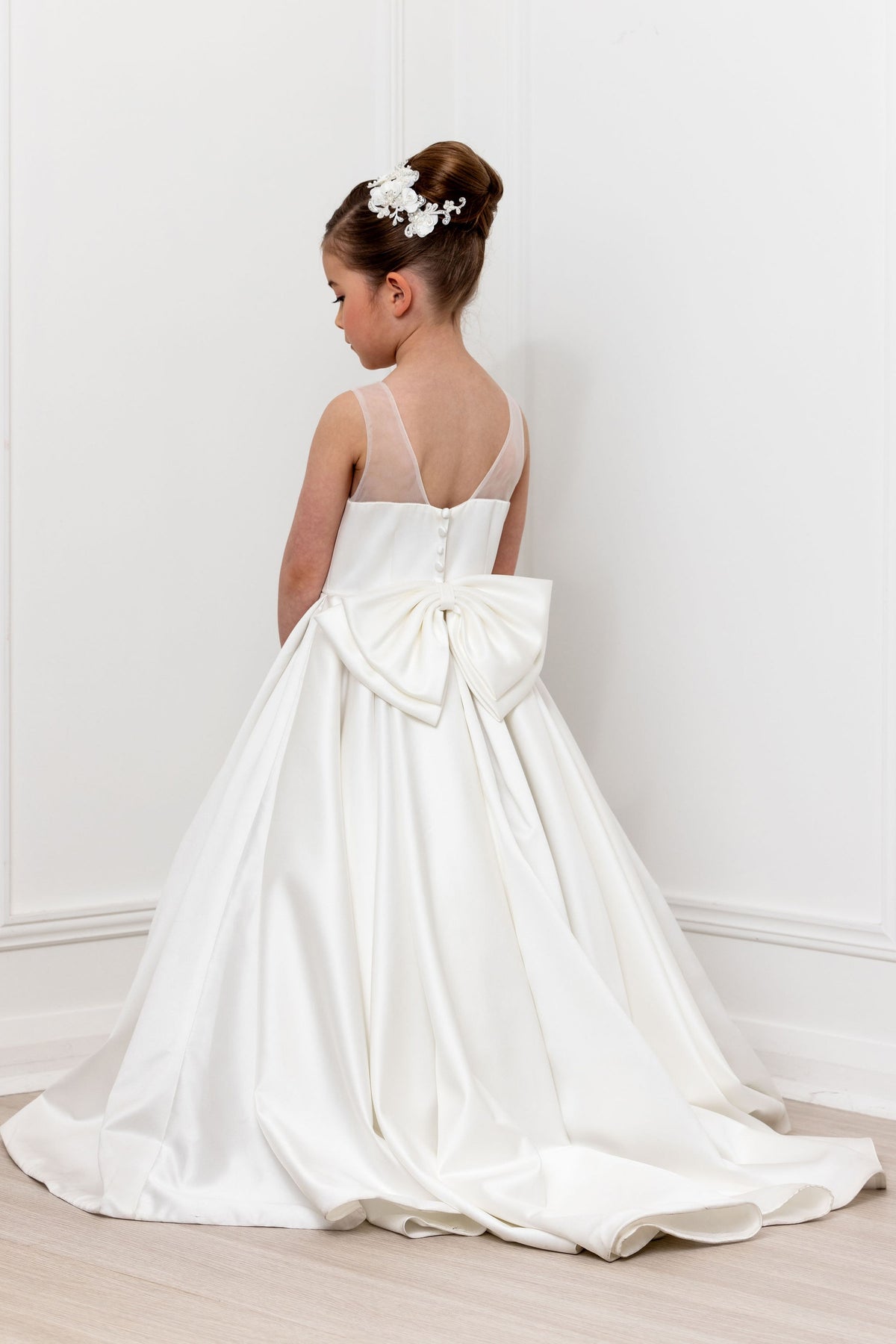 The gorgeous Mary has a box pleat satin skirt, illusion neckline, bow on the back and the option to add mini train.
