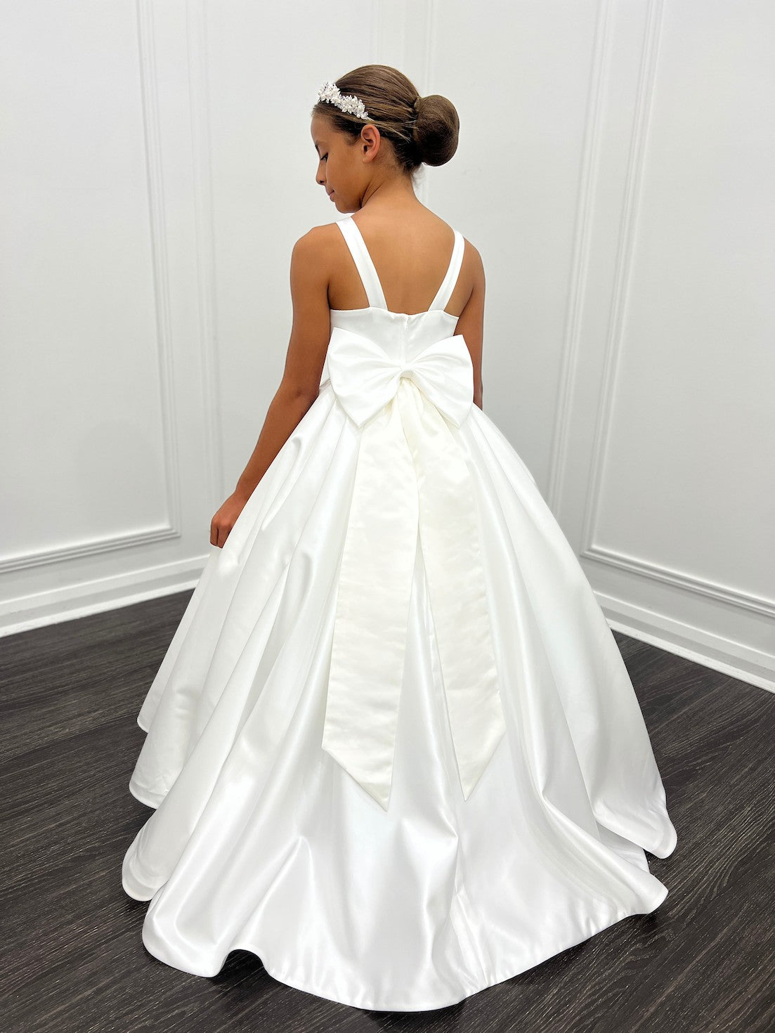 The Victoria is so elegant. The dress has a beautiful satin skirt with mini train and bow on the back.