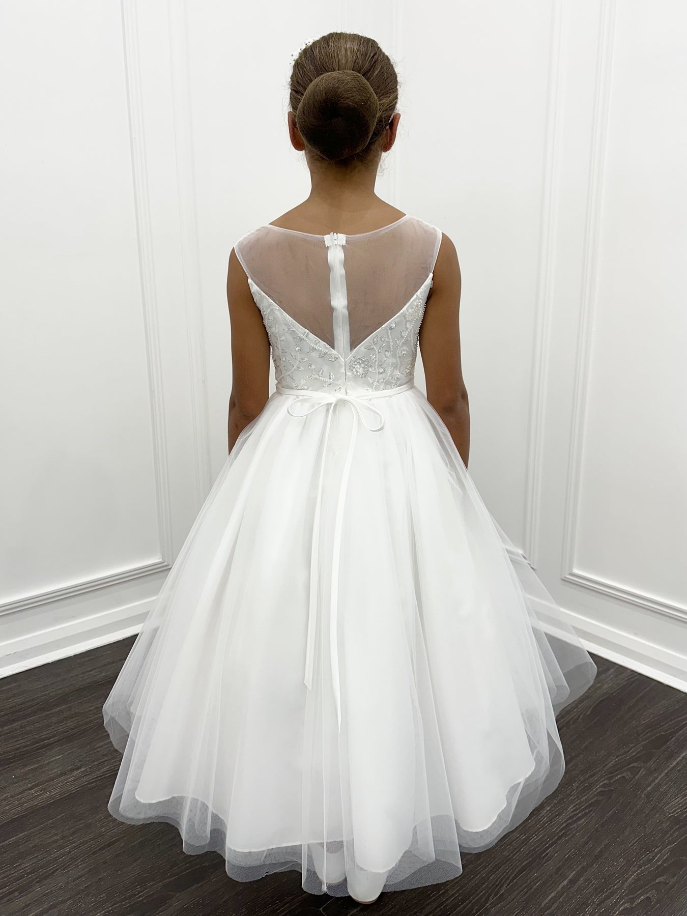Lace bodice with illusion neckline and tea-length tulle skirt.