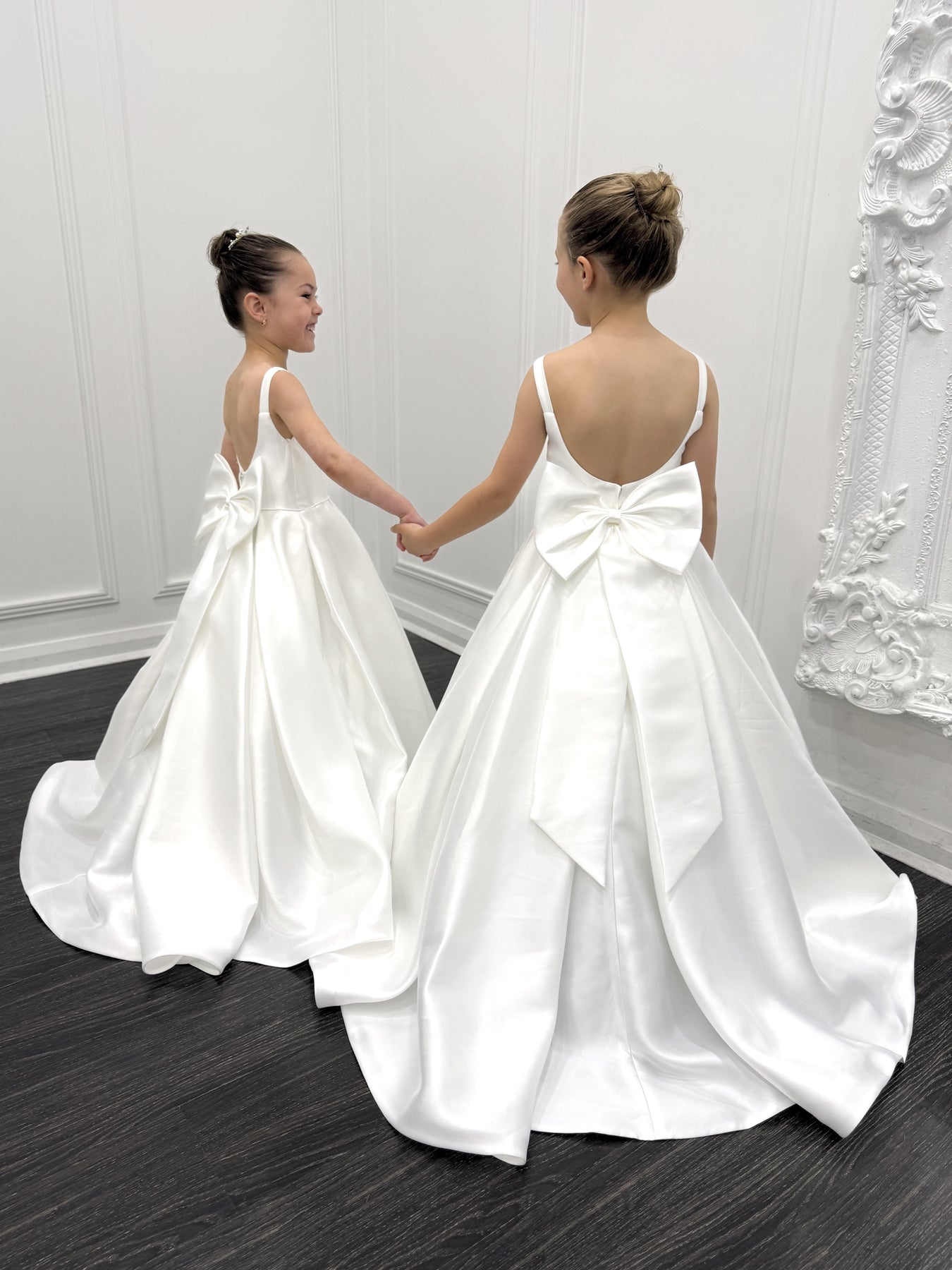 Cleo has a floor-length box pleat skirt, scoop back, mini train and bow with tails on the back.Cleo is the most elegant Flower Girl dress which compliments all bridal gowns. Made from luxurious mikado, every girl feels like a Princess in this dress.