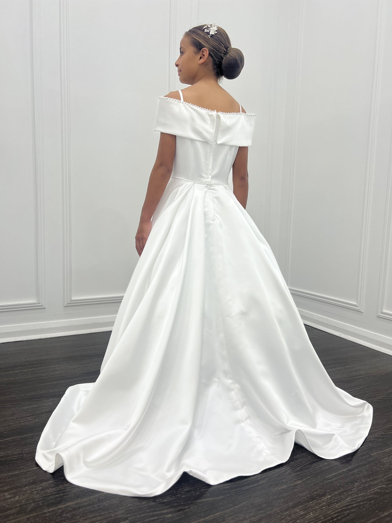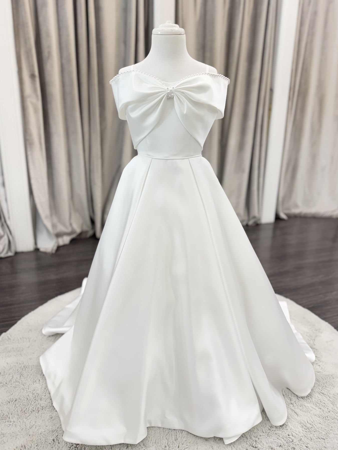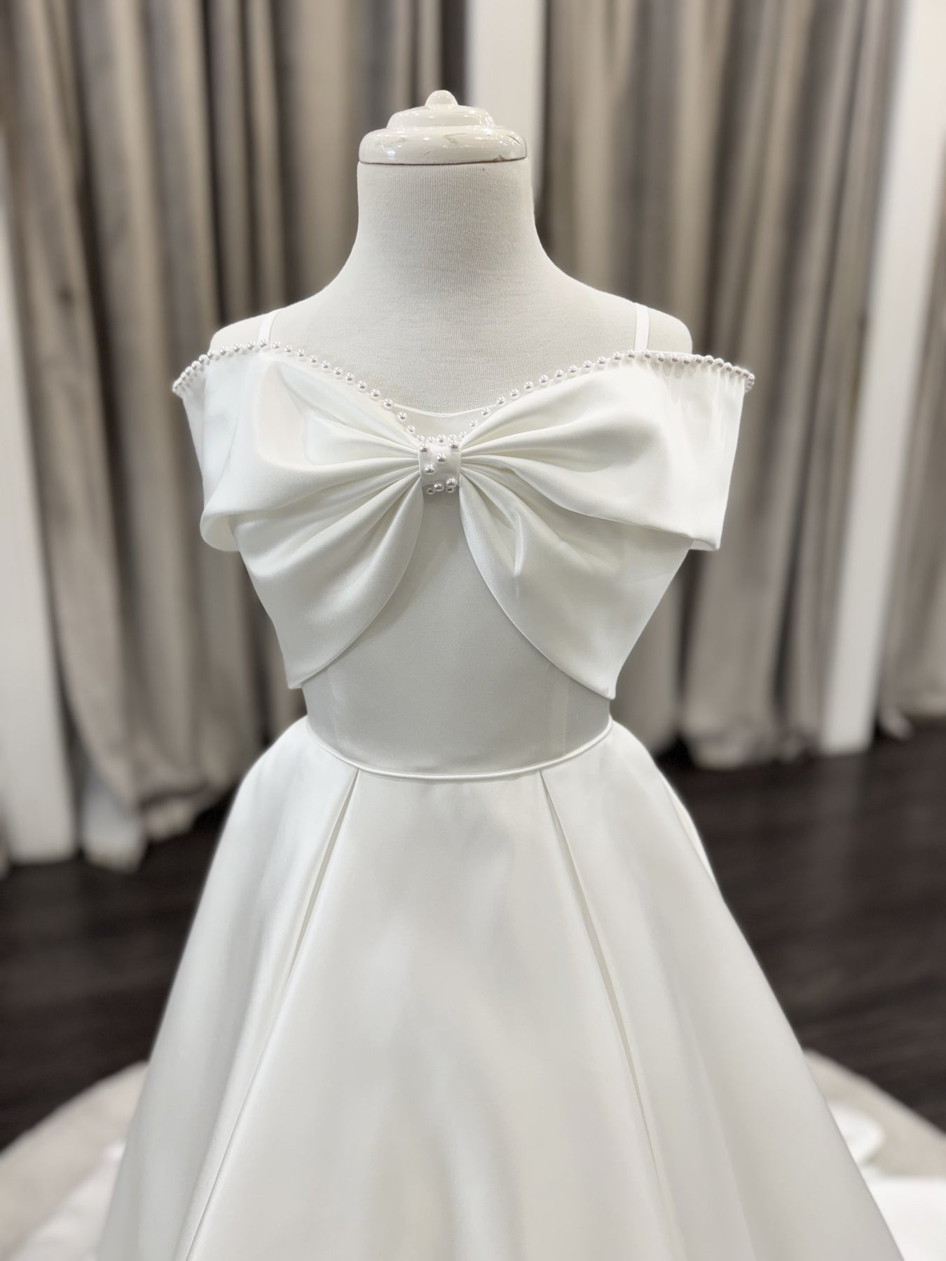 Absolutely stunning satin dress with box-pleat skirt, mini train, bow detail bodice and pearl embellishments.