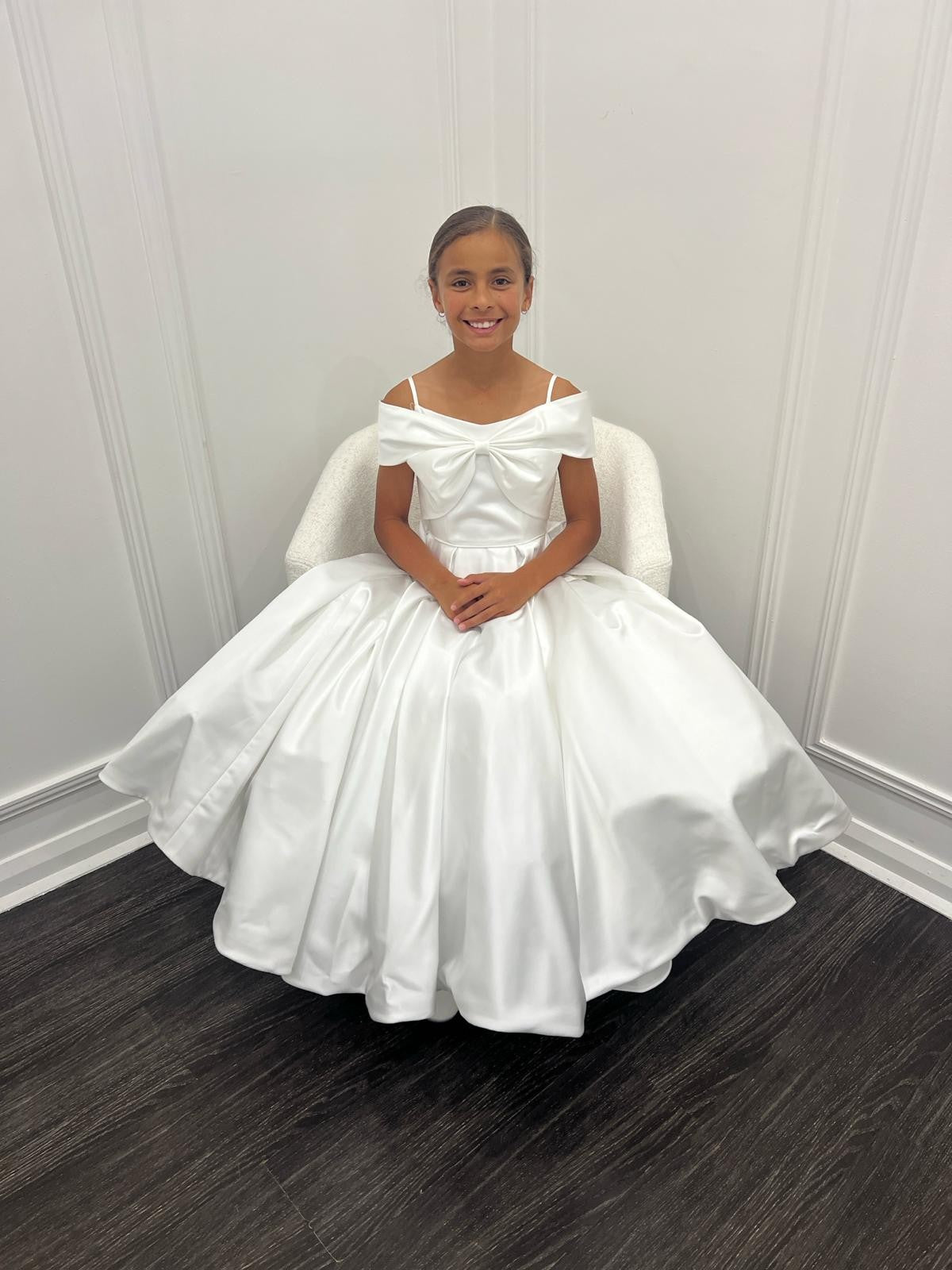 Gorgeous satin dress with bow detail bodice and floor length box pleat skirt.