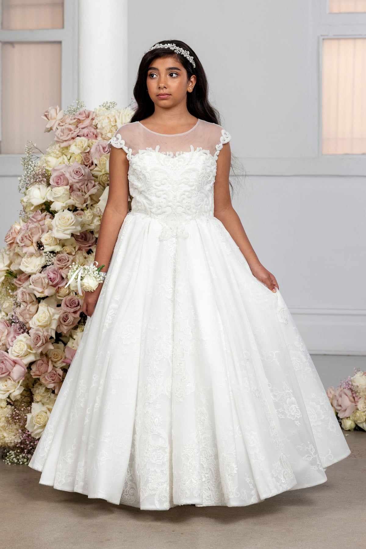 The Claudia dress has a beaded lace bodice with illusion neckline and back. The dress has an amazing floor-length lace Belle skirt with mini train.