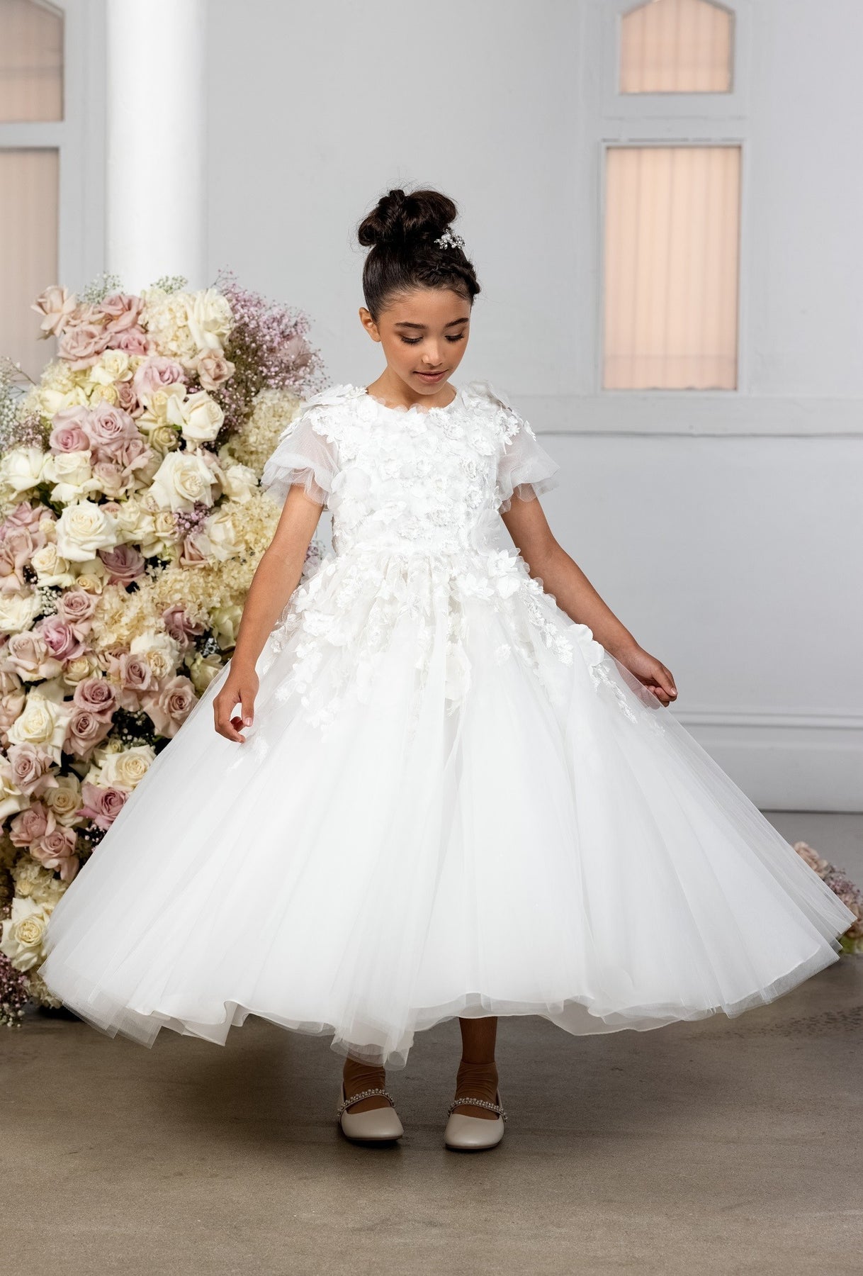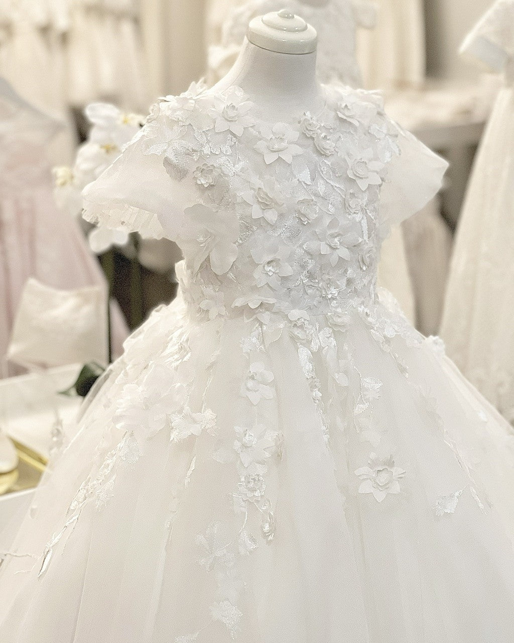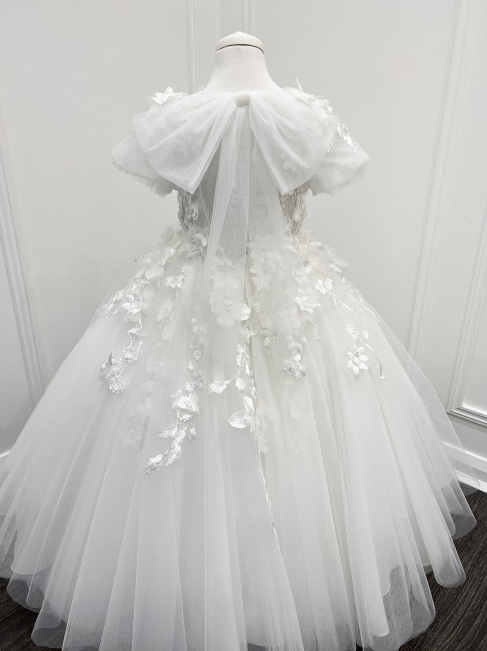The most stunning dress with 3D floral lace bodice, open back and ballerina floor length skirt.
