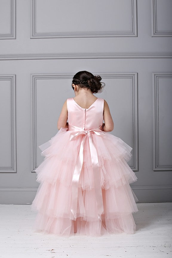 Gown features a satin bodice and high/ low skirt. The skirt itself has layers and layers of tulle.
