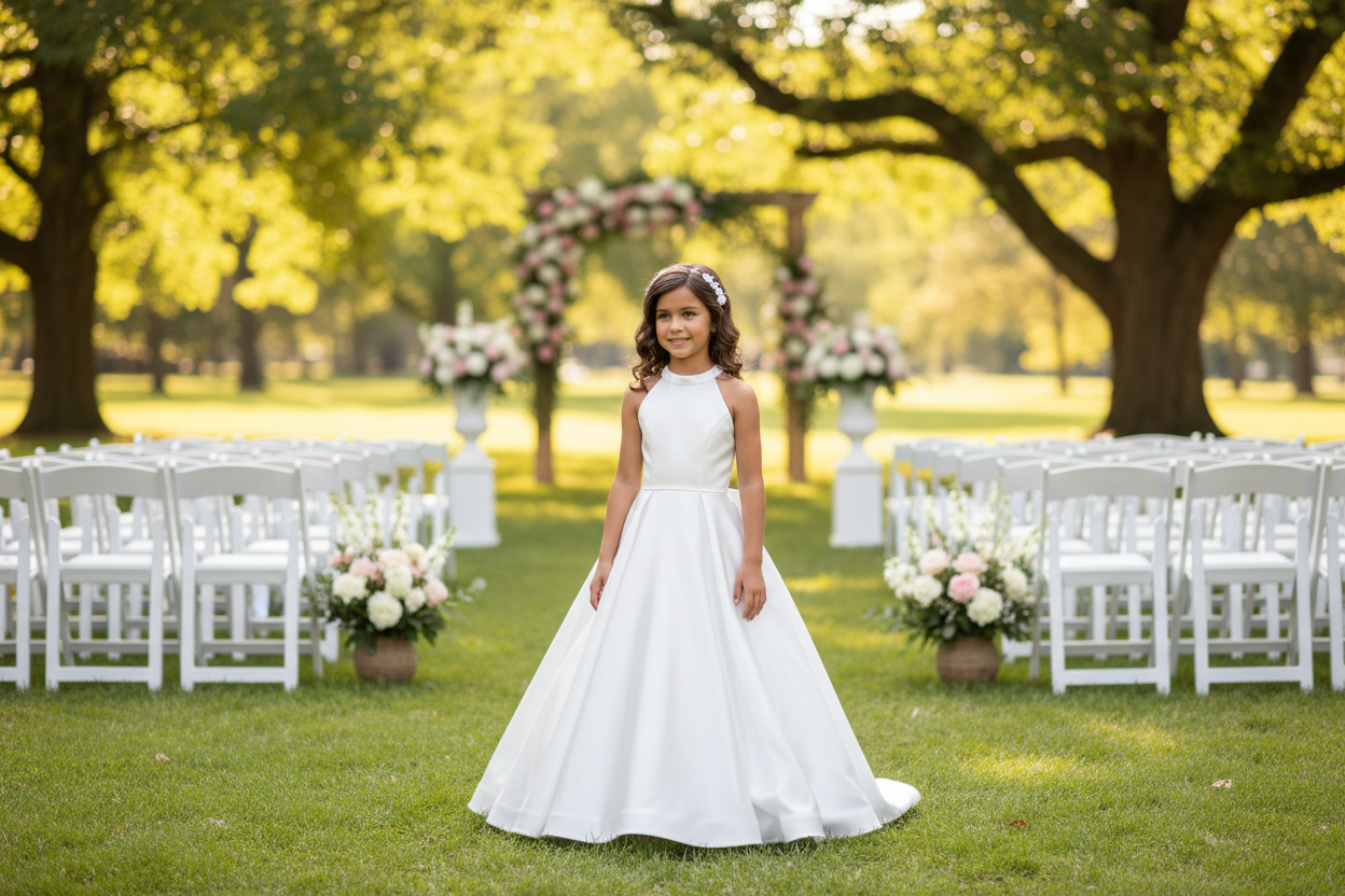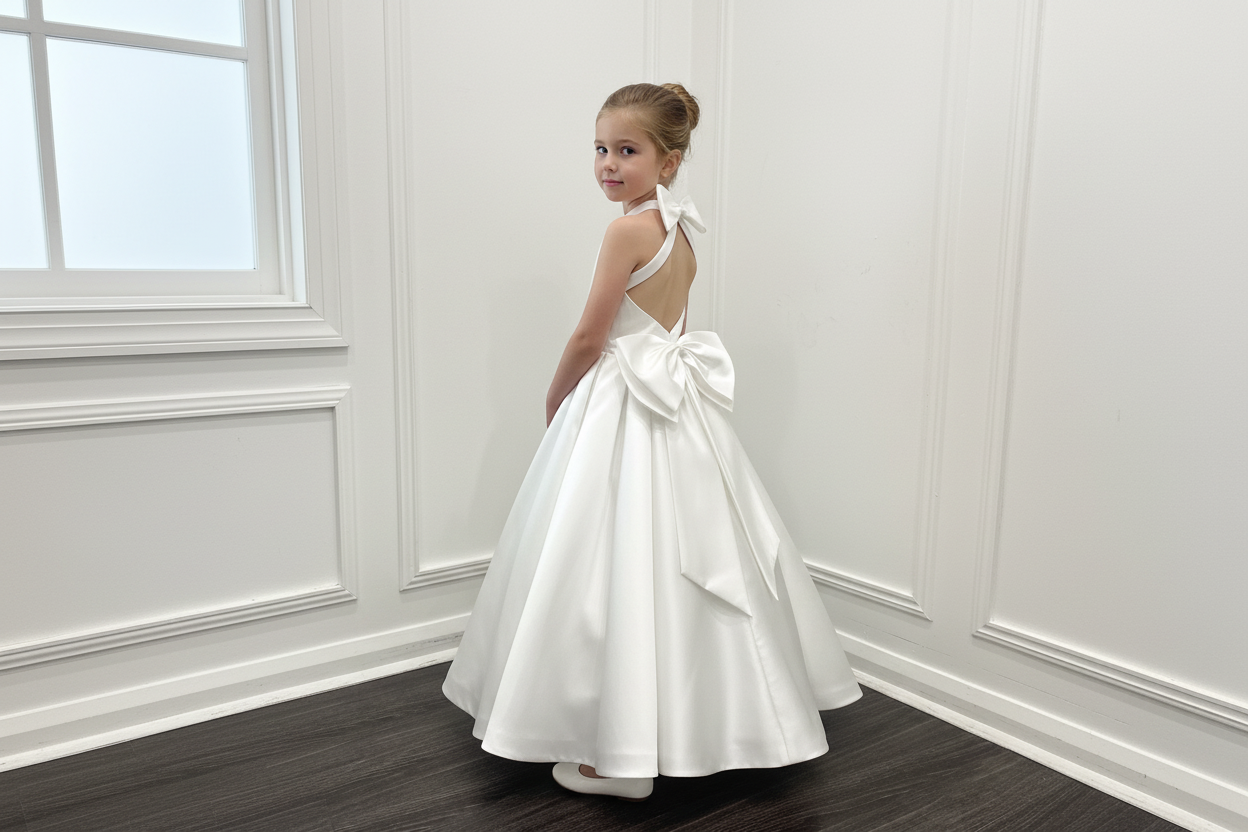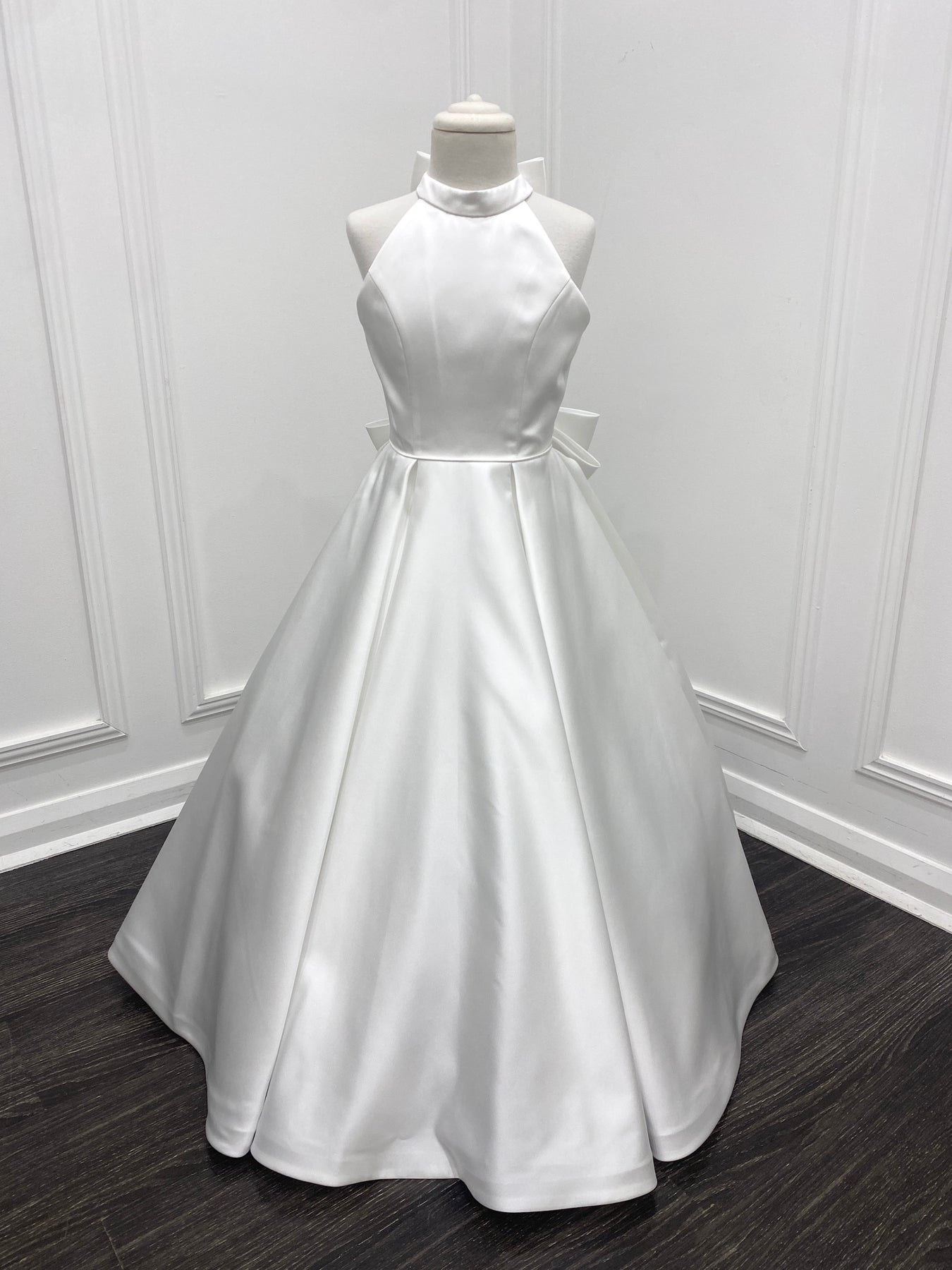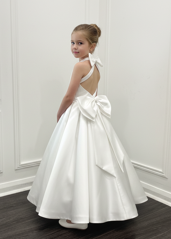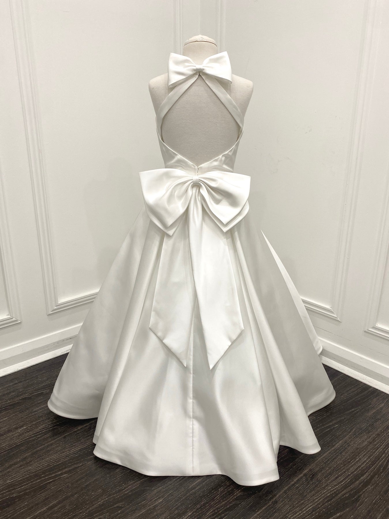 The most stunning satin dress with floor-length box-pleat skirt. The dress has a statement open back with bow at the back of the neck and waist.