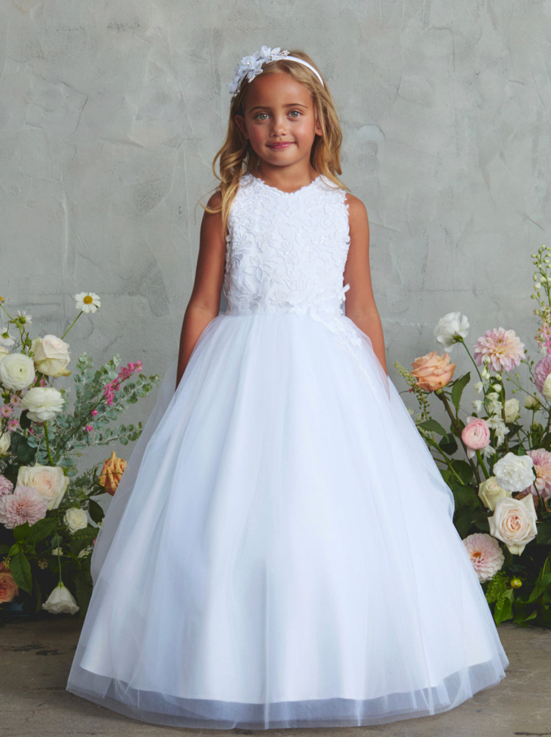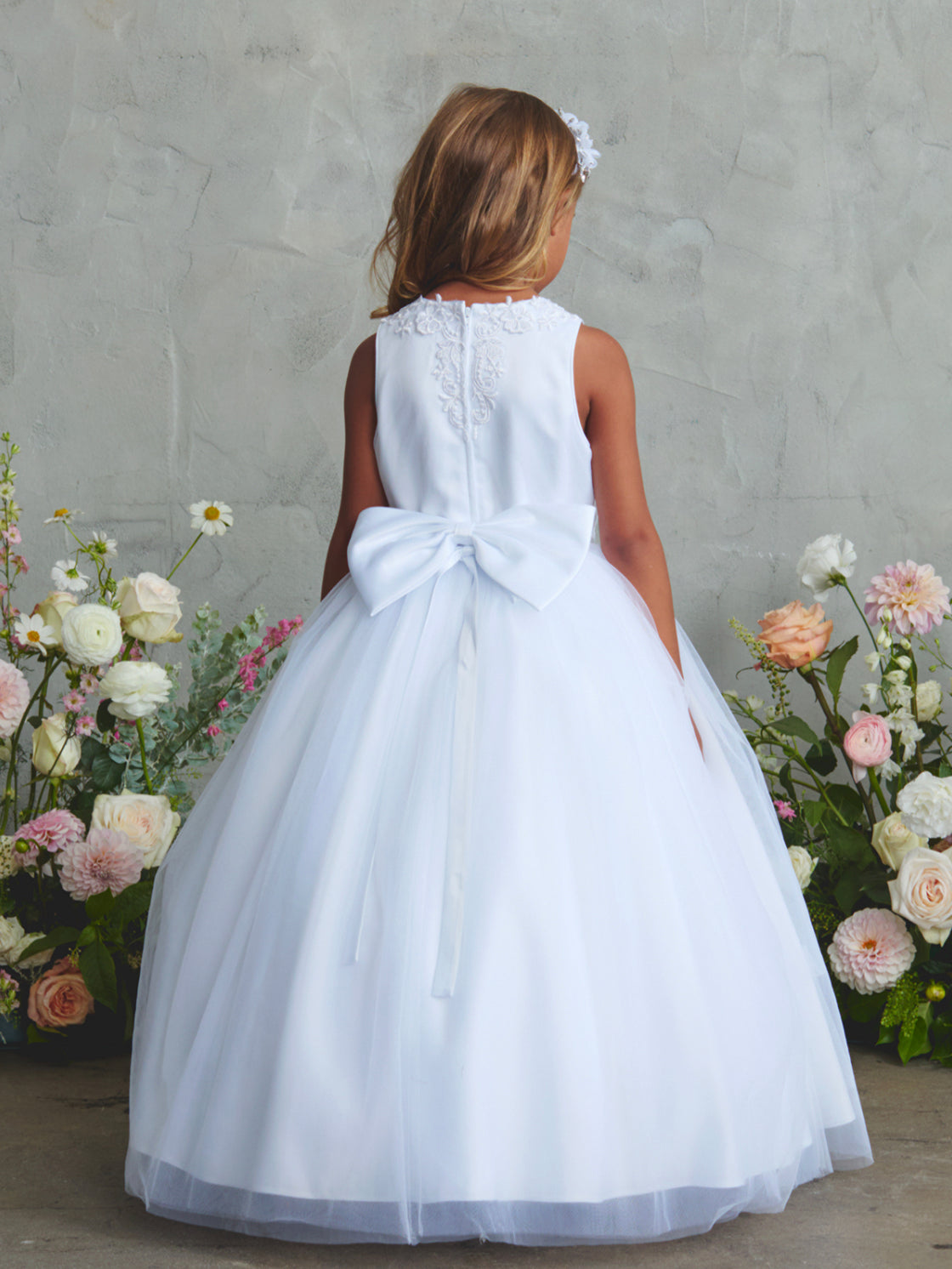 Gorgeous dress with lace bodice with high neckline, tulle skirt and bow on the back.