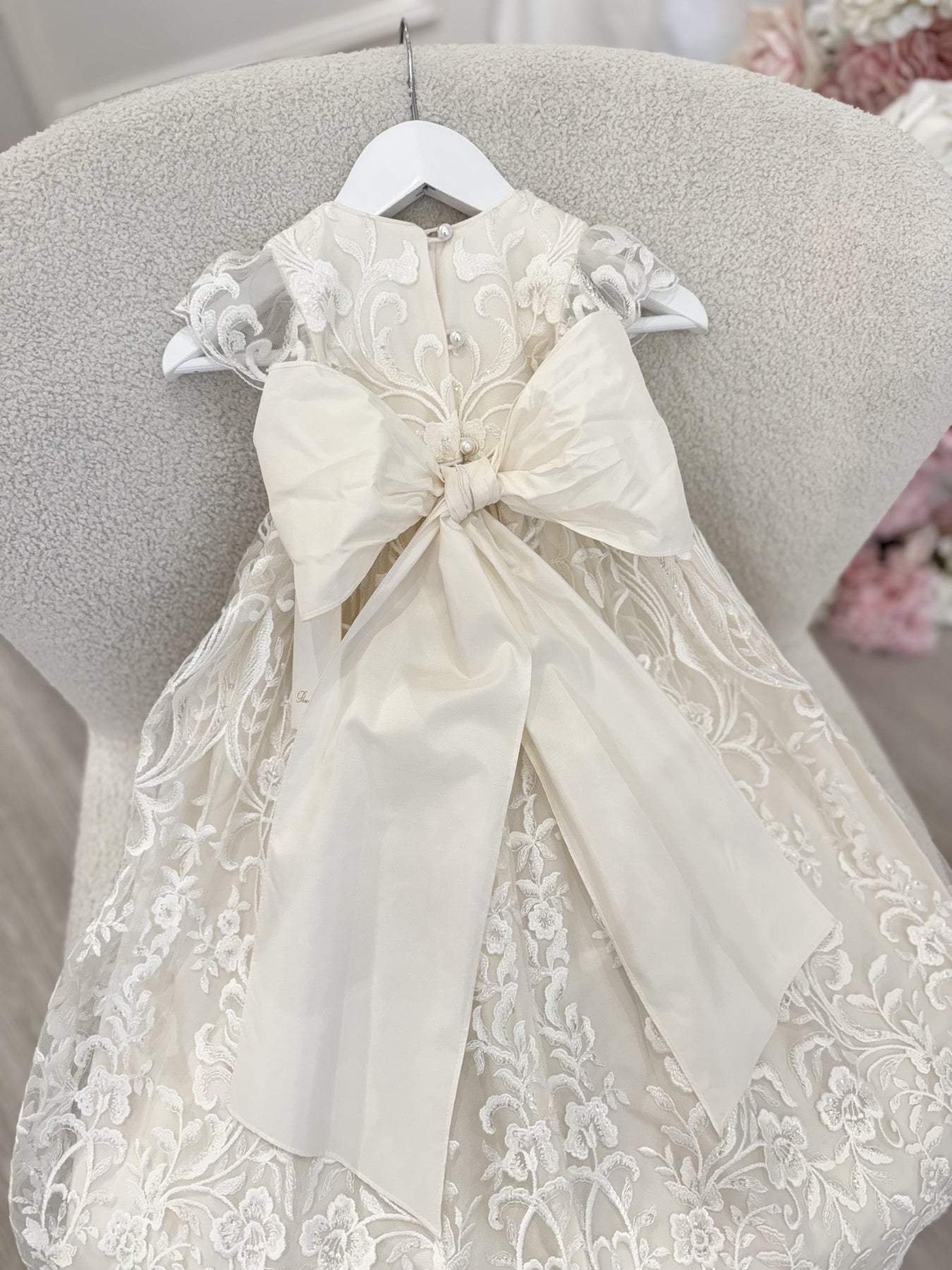 This beautiful limited edition Christening Gown is made from a stunning embroidered lace with subtle sequins and is lined with 100% silk. The set includes matching Bonnet & Booties.