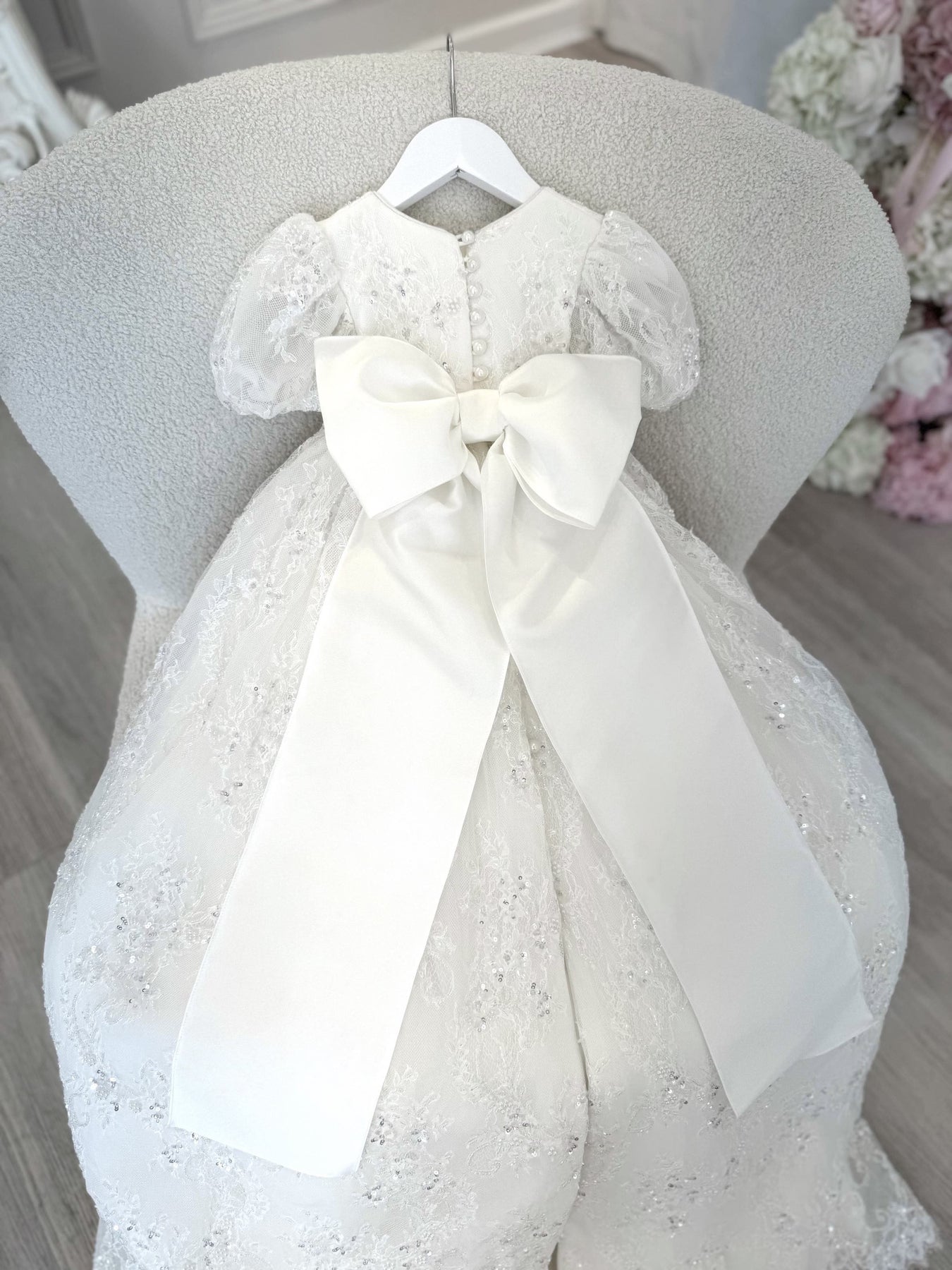 The Elaina Gown is handmade in Melbourne from the most stunning luxe beaded lace (with soft silver undertones). The gown is lined with silk-mikado and has a bow on the back.