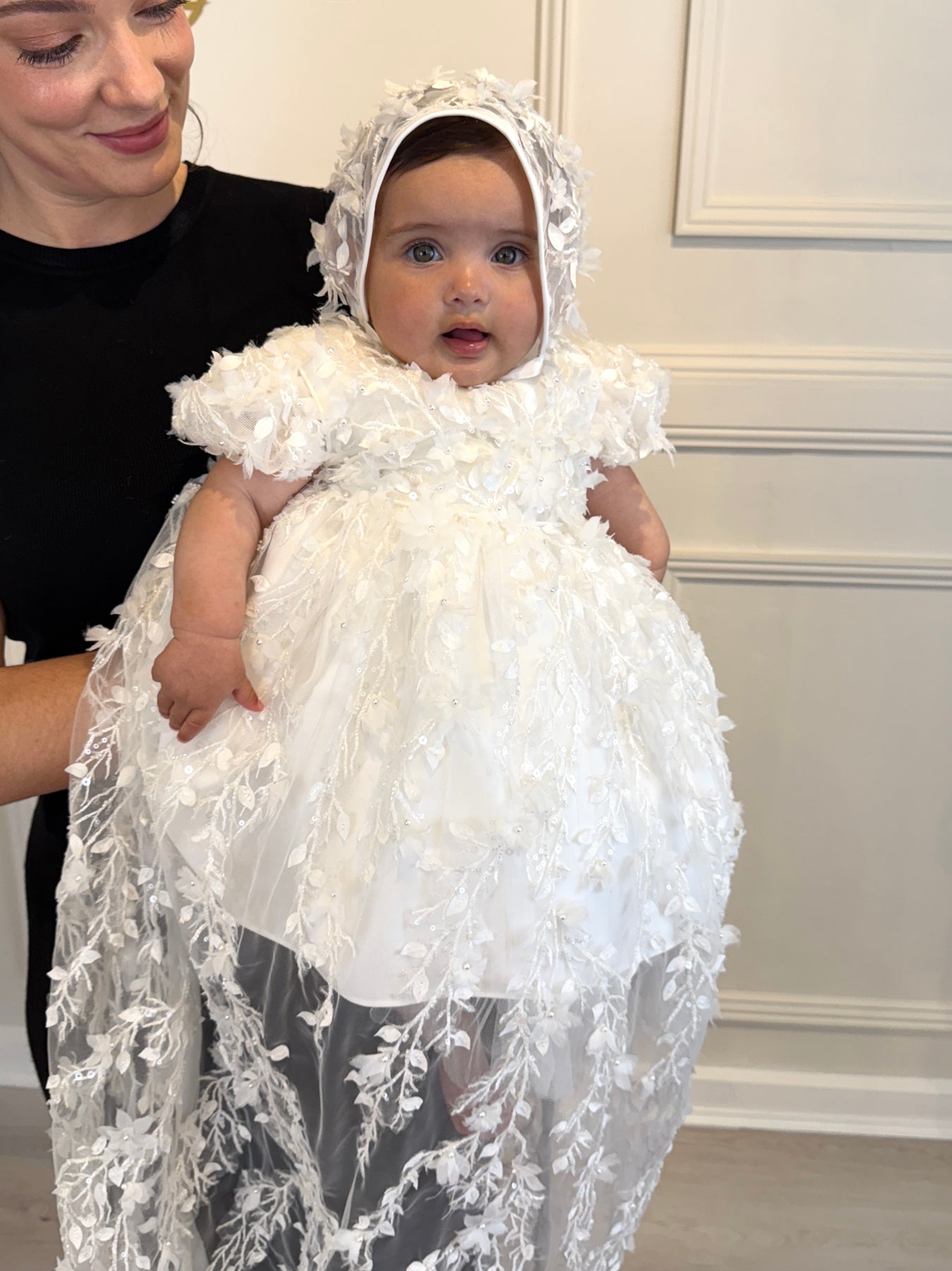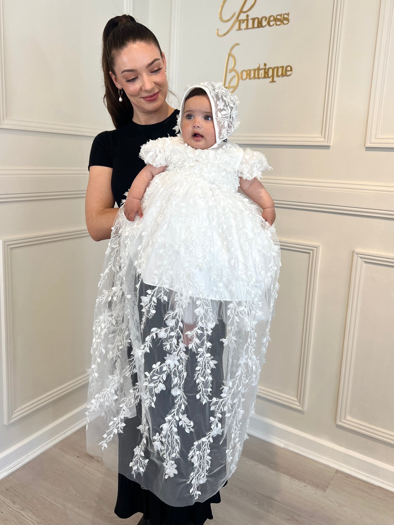 The set includes removable lace pini, dress, bonnet & booties.
