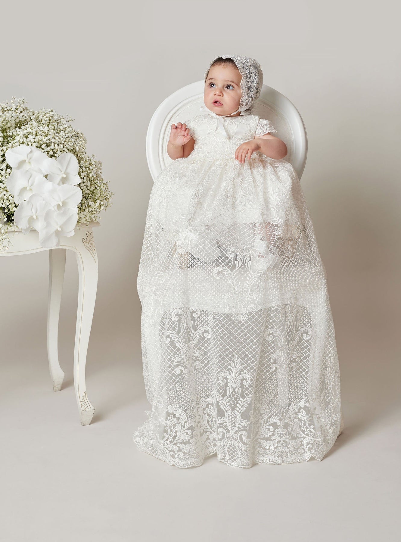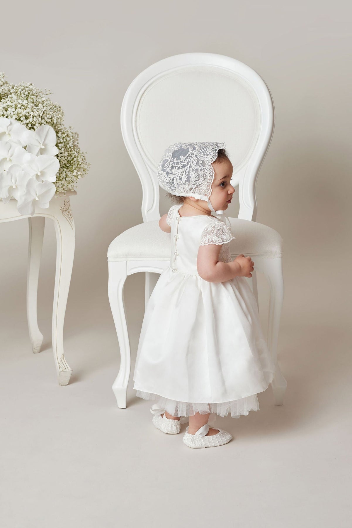 The Parker Pini features a timeless lace with subtle sequins. The set includes removable long Lace Pini, coordinating matching Dress with lace bodice and satin skirt, Bonnet & Booties.