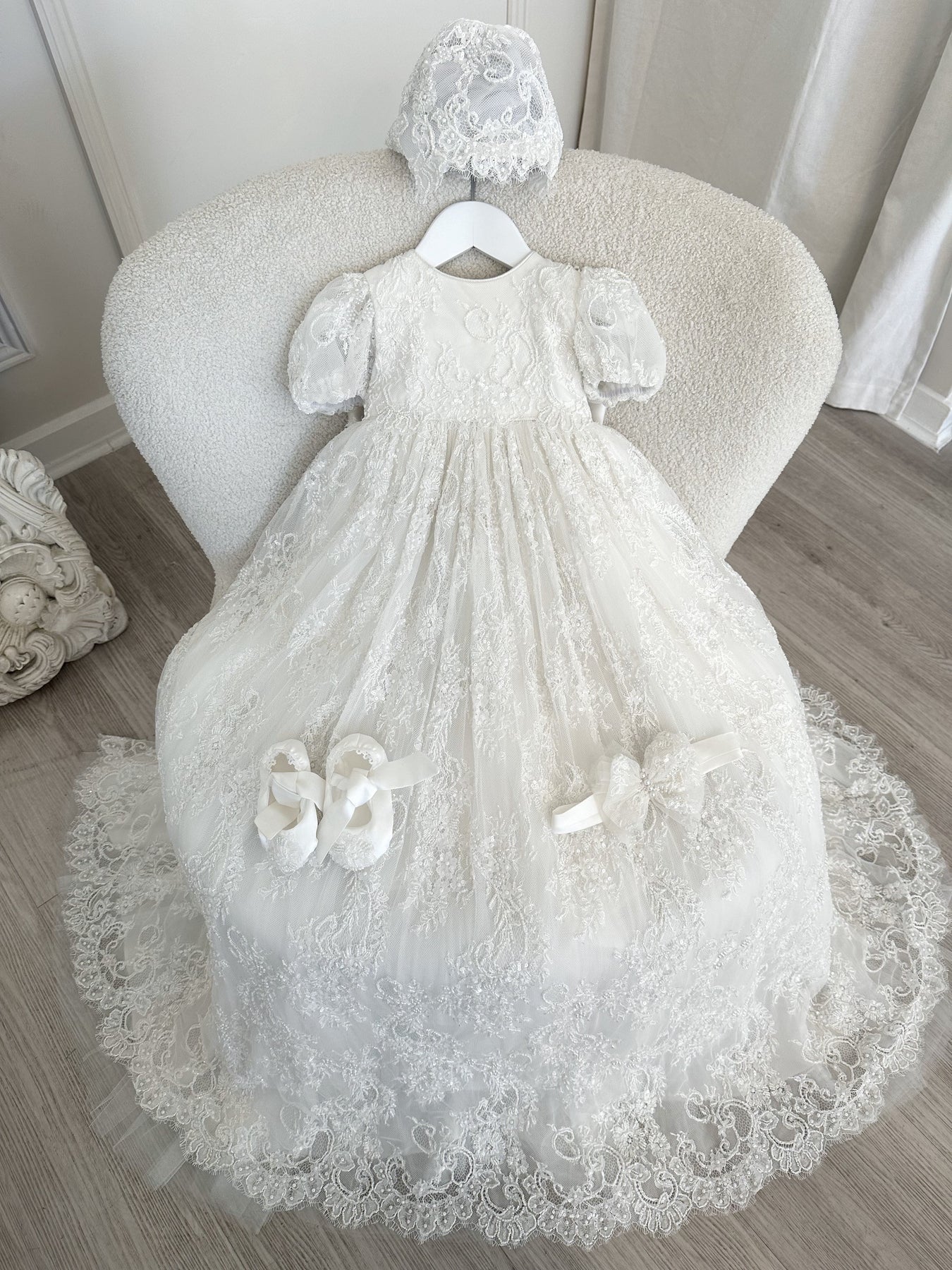 The set includes Bonnet & Booties. Optional upgrade to add matching Headband.