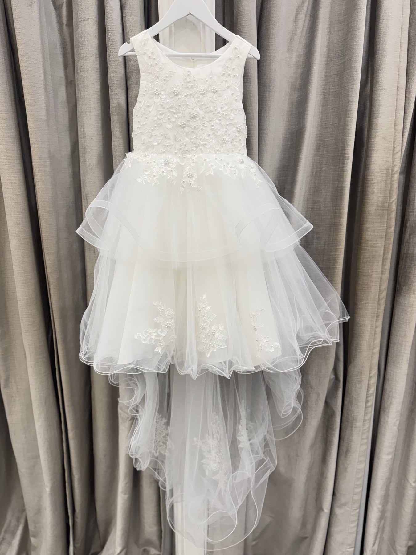 Gorgeous dress with lace bodice, tulle skirt and mini train.