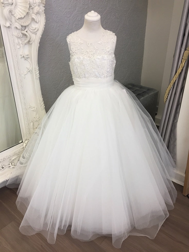 The Amelia Dress is simply breath-taking. Featuring a full, tulle skirt, beaded lace bodice and a gorgeous bow on the back to complete the look, this gown is sure to impress.