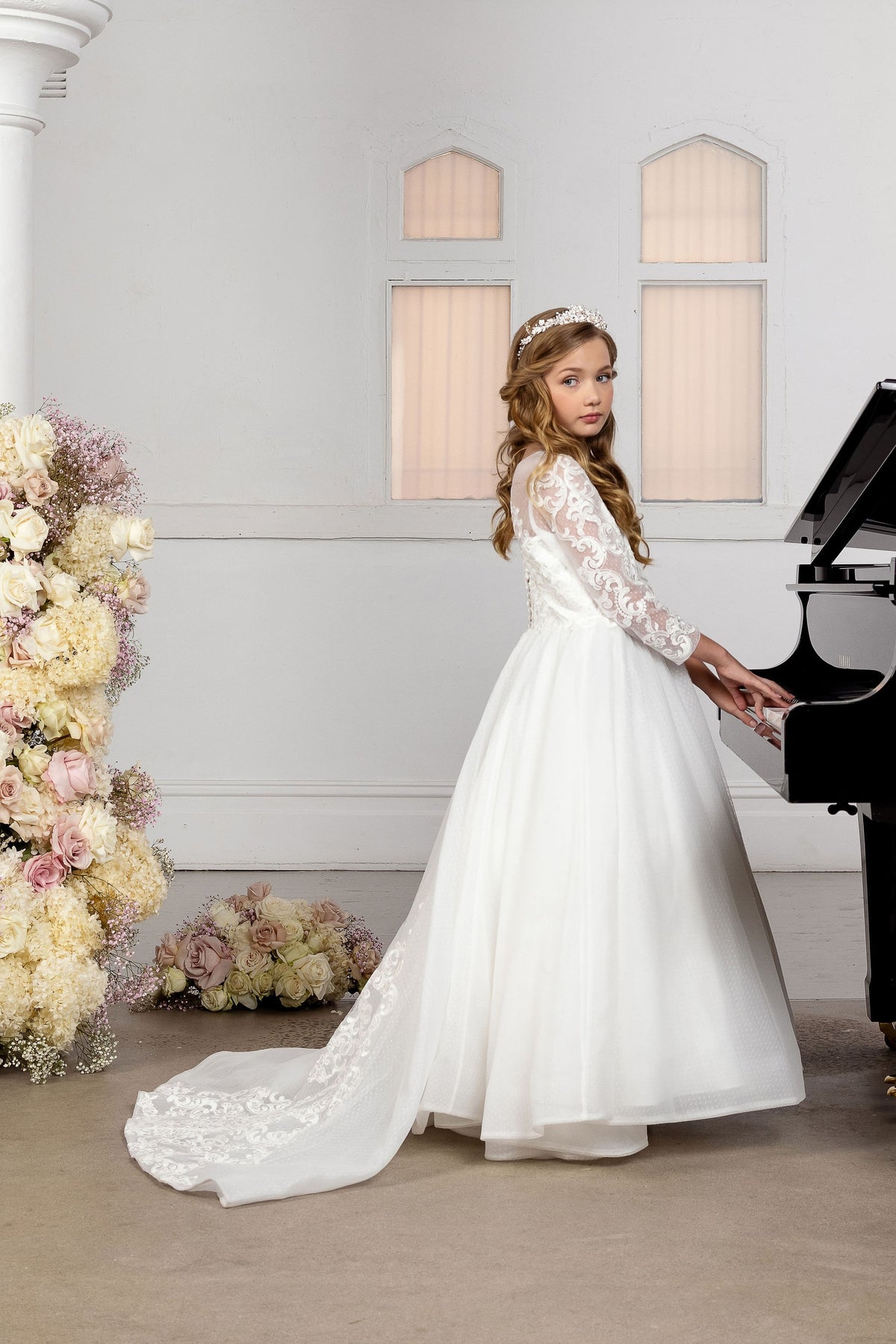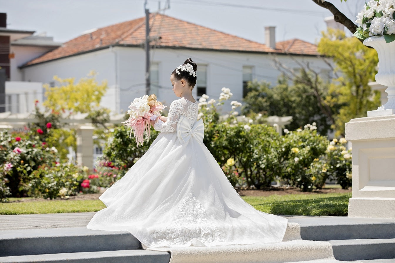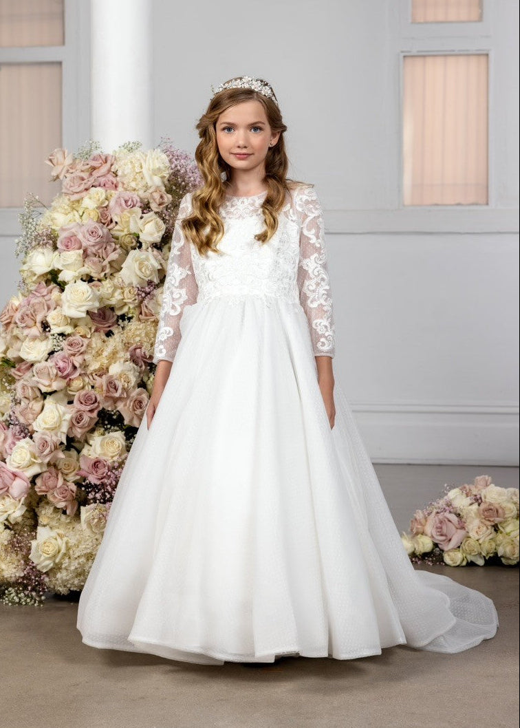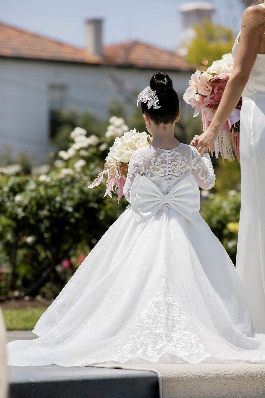 The Annie dress has a long sleeve lace bodice with a subtle polka dot tulle skirt and stunning train with lace accents.