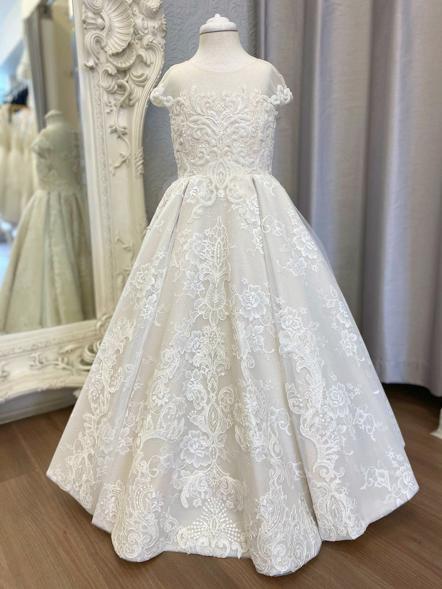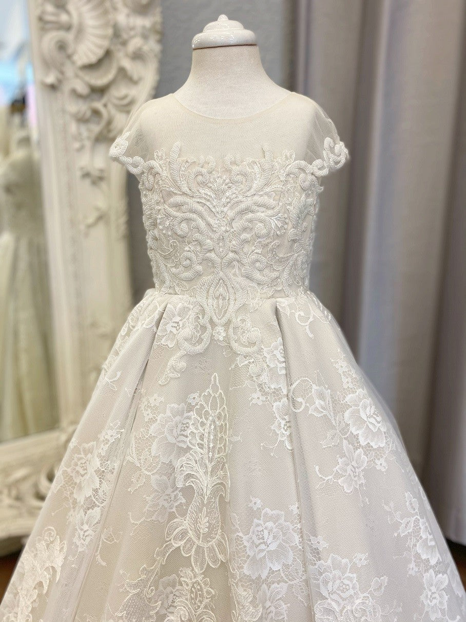 The Claudia dress has a beaded lace bodice with illusion neckline and back. The dress has an amazing floor-length lace Belle skirt.