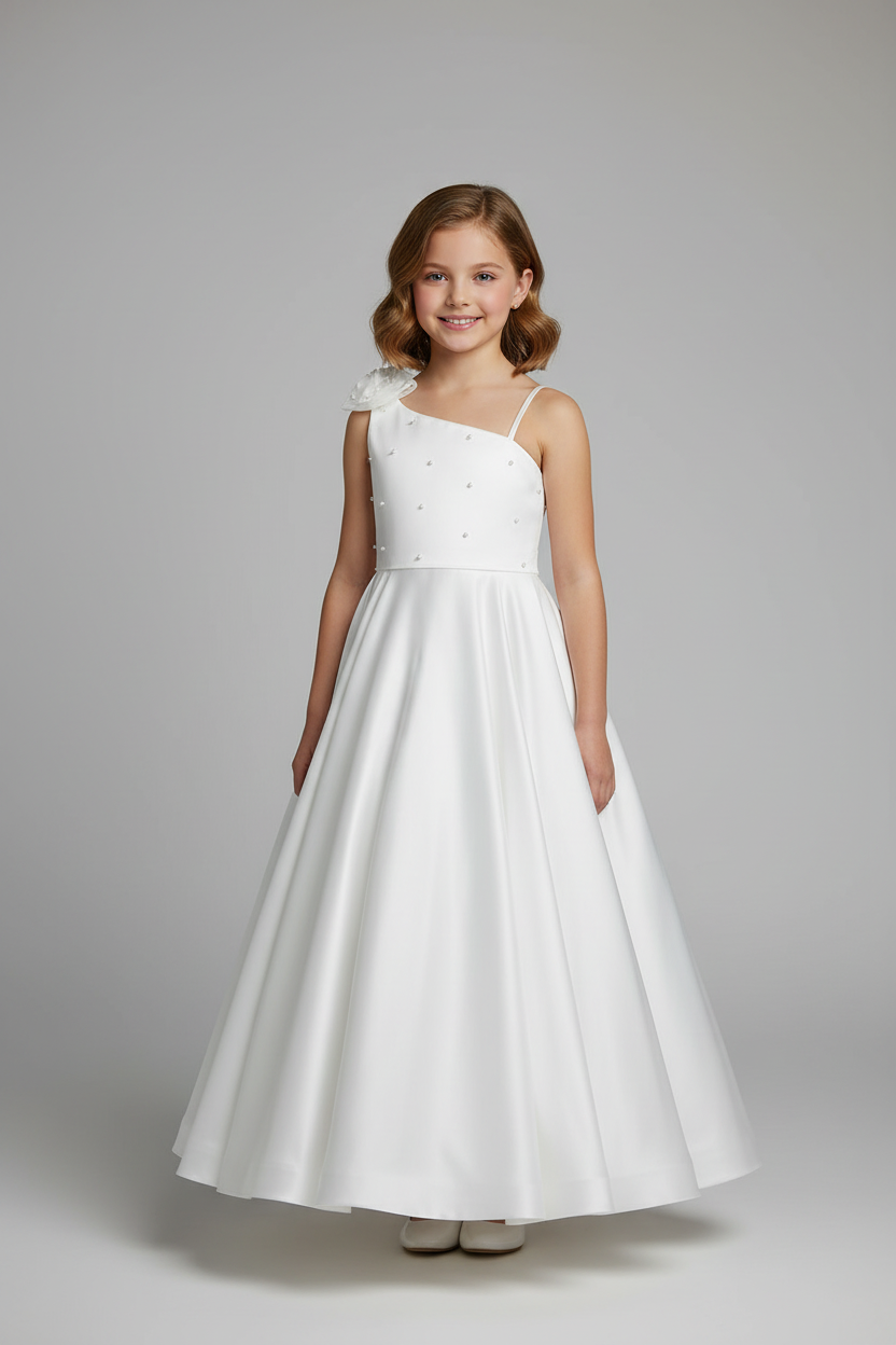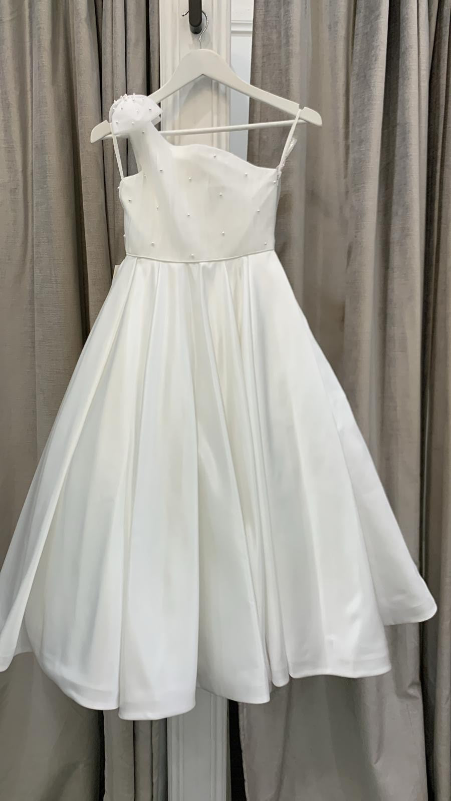 The Fia dress has a gorgeous one-shoulder tulle bodice with pearls and bow on the shoulder. The dress has piping at the waist and a box-pleat, floor-length satin skirt.