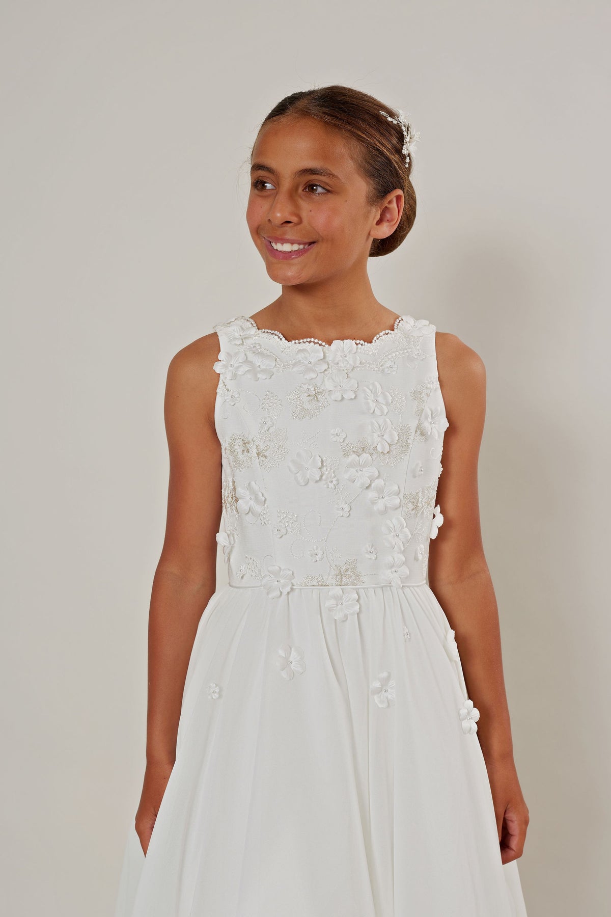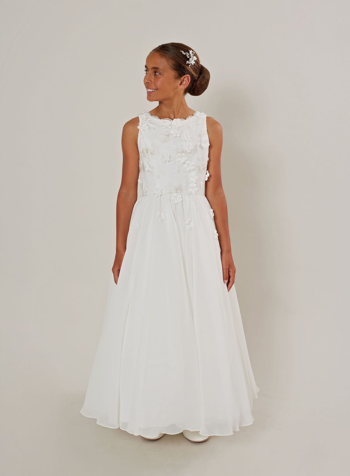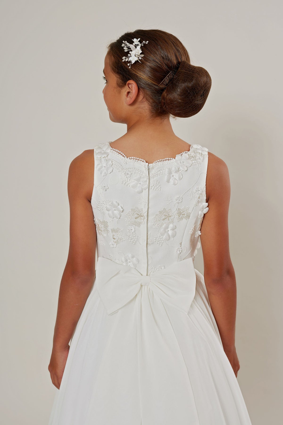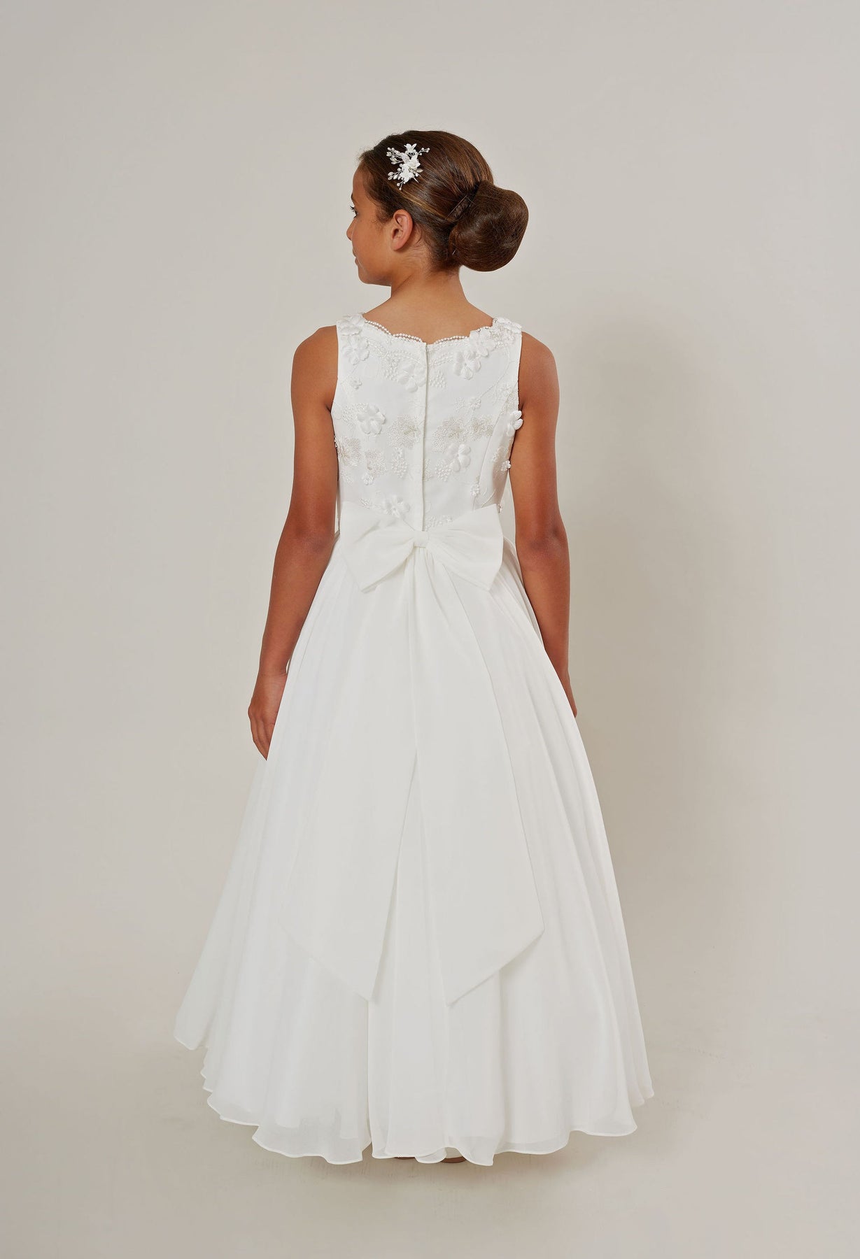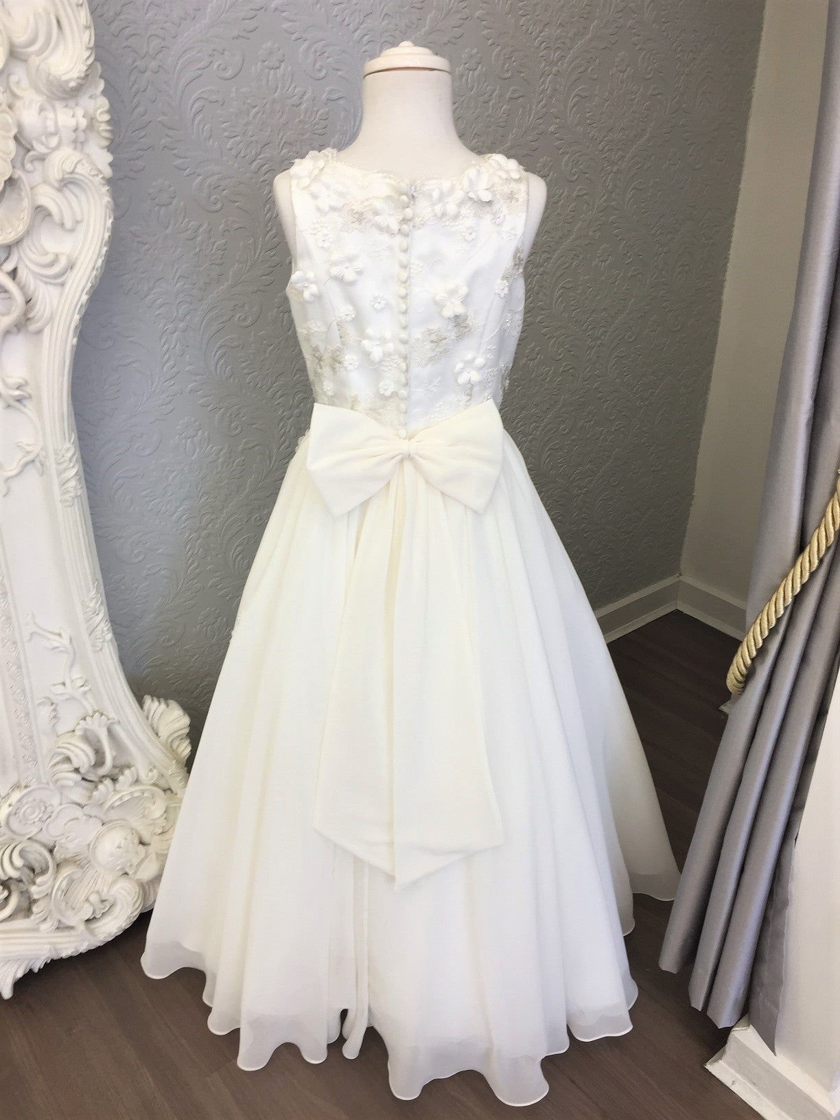 The stunning Riley dress has a floral lace bodice with tiny pearls and silver embroidery detail. The A-Line chiffon skirt gives the gown an elegant feeling. Zip closure with buttons down the back and a sweet bow complete the dress.