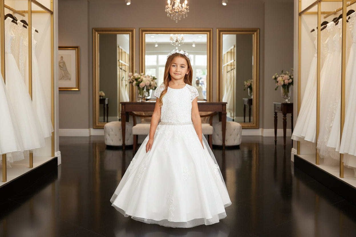 Lace bodice with cap sleeves, pearl and beaded chevron pattern waist detail, rear centre zipper and sash tie back. Ankle length tulle skirt. Fully lined.